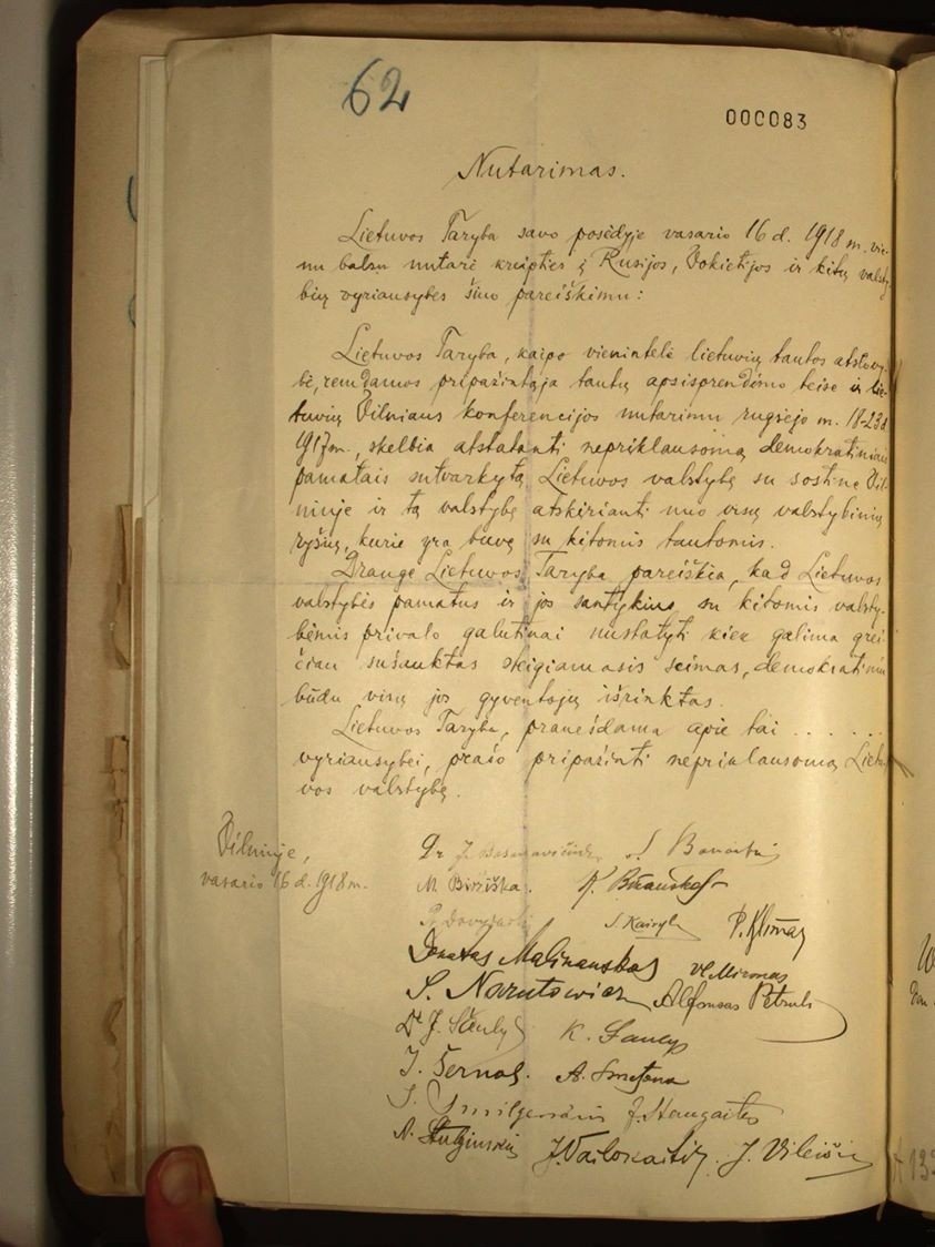Jono Basanavičiaus pirmininkaujama Lietuvos Taryba Nepriklausomybės aktą pasirašė 1918 metų vasario 16 dieną Vilniuje.