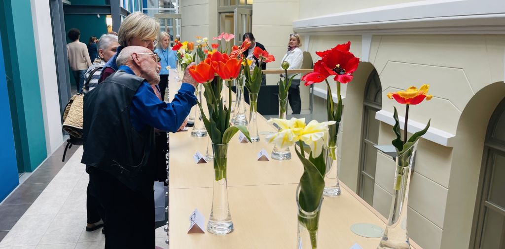 Po dvejų metų pertraukos bibliotekoje pristatoma tulpių paroda džiugina žydėjimo grožiu, veislių įvairove, spalvų ir formų gausa, iškalbingais pavadinimais. Iš Latvijos atvykęs, netoli Bauskės 800 kvadratinių metrų ploto gėlynus auginantis Janis Salensas sakė, kad tulpes reikia mylėti, šitos gėlės tai jaučia.