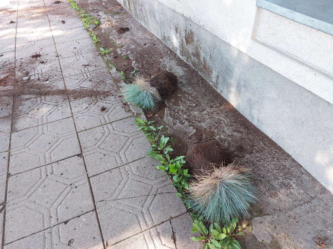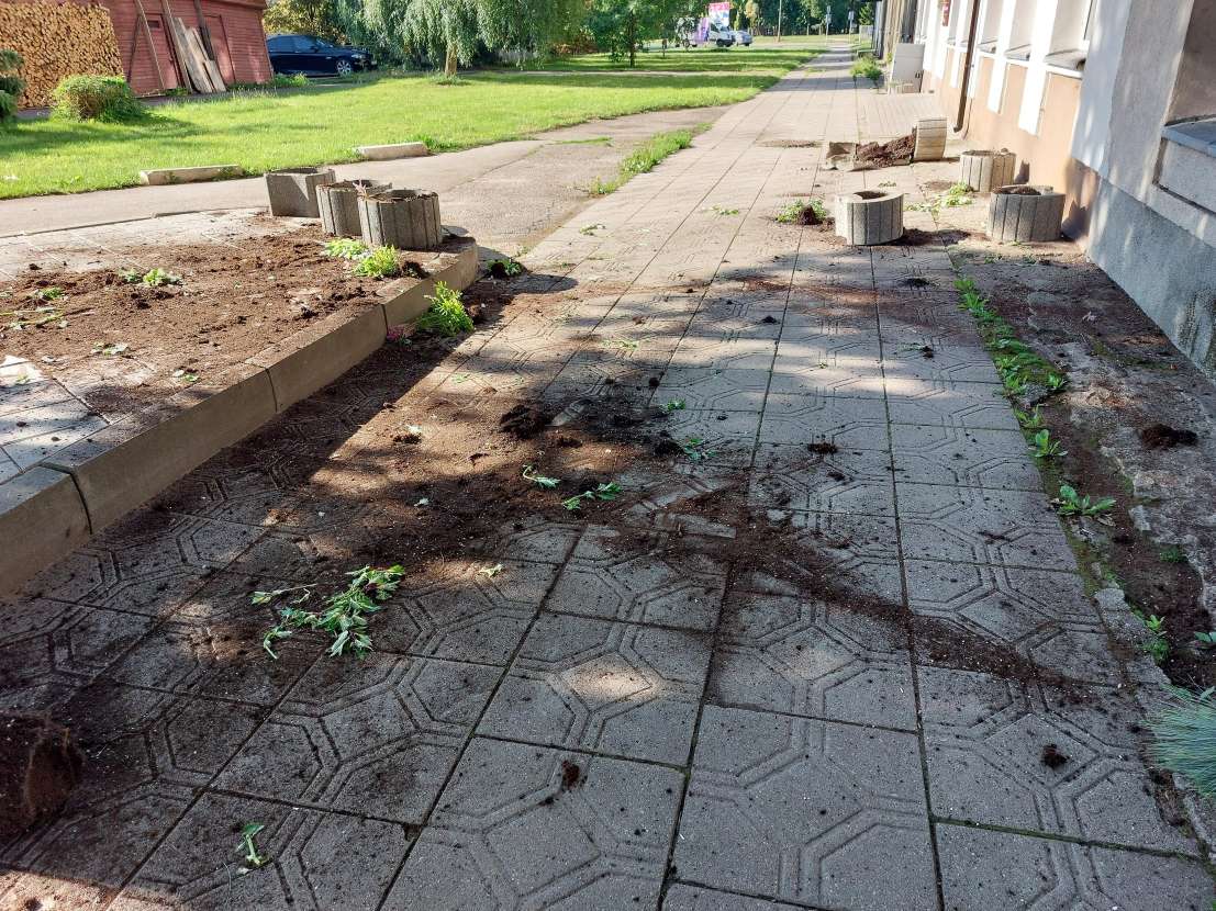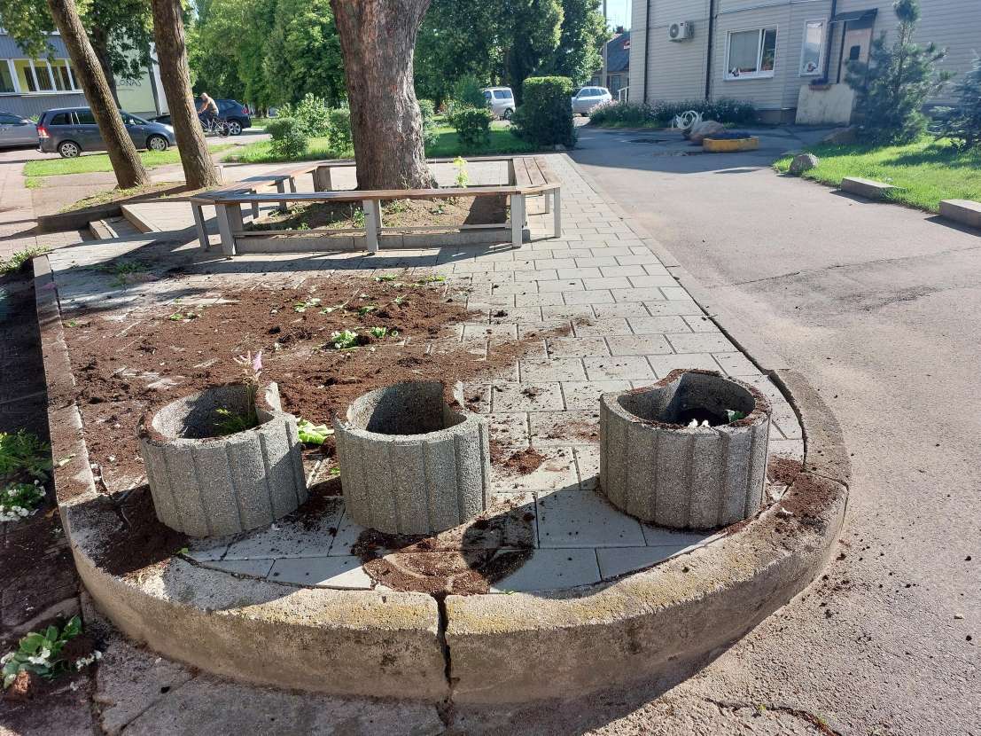 Po nakties į penktadienį iš šios puošmenos teliko graudžiai atrodantis vaizdas – gėlių daigai išrauti ir sumaitomi, žemės išdrabstytos.
