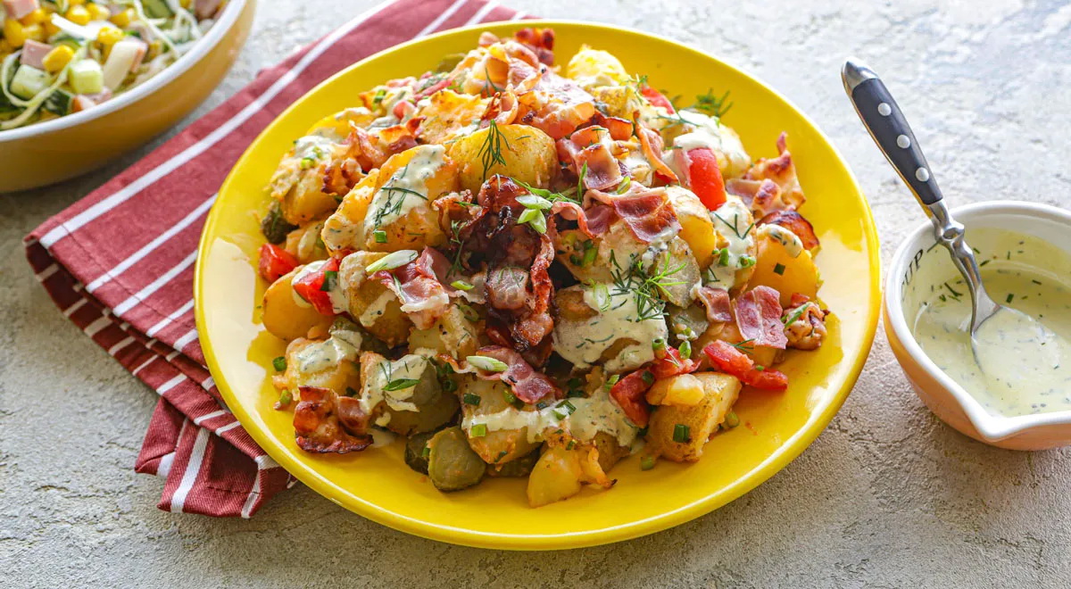 Reikės (6 porcijoms): 800 g bulvių (sezono metu – šviežių), 2 pomidorų, 2 marinuotų agurkų, 100 g šviežios šoninės, 240 ml natūralaus jogurto, 5 šaukštų alyvuogių aliejaus, 1 šaukštelio garstyčių, 30 g svogūno laiškų, 20 g krapų, 1 šaukštelio džiovintų čiobrelių, druskos, šviežiai maltų juodųjų pipirų.