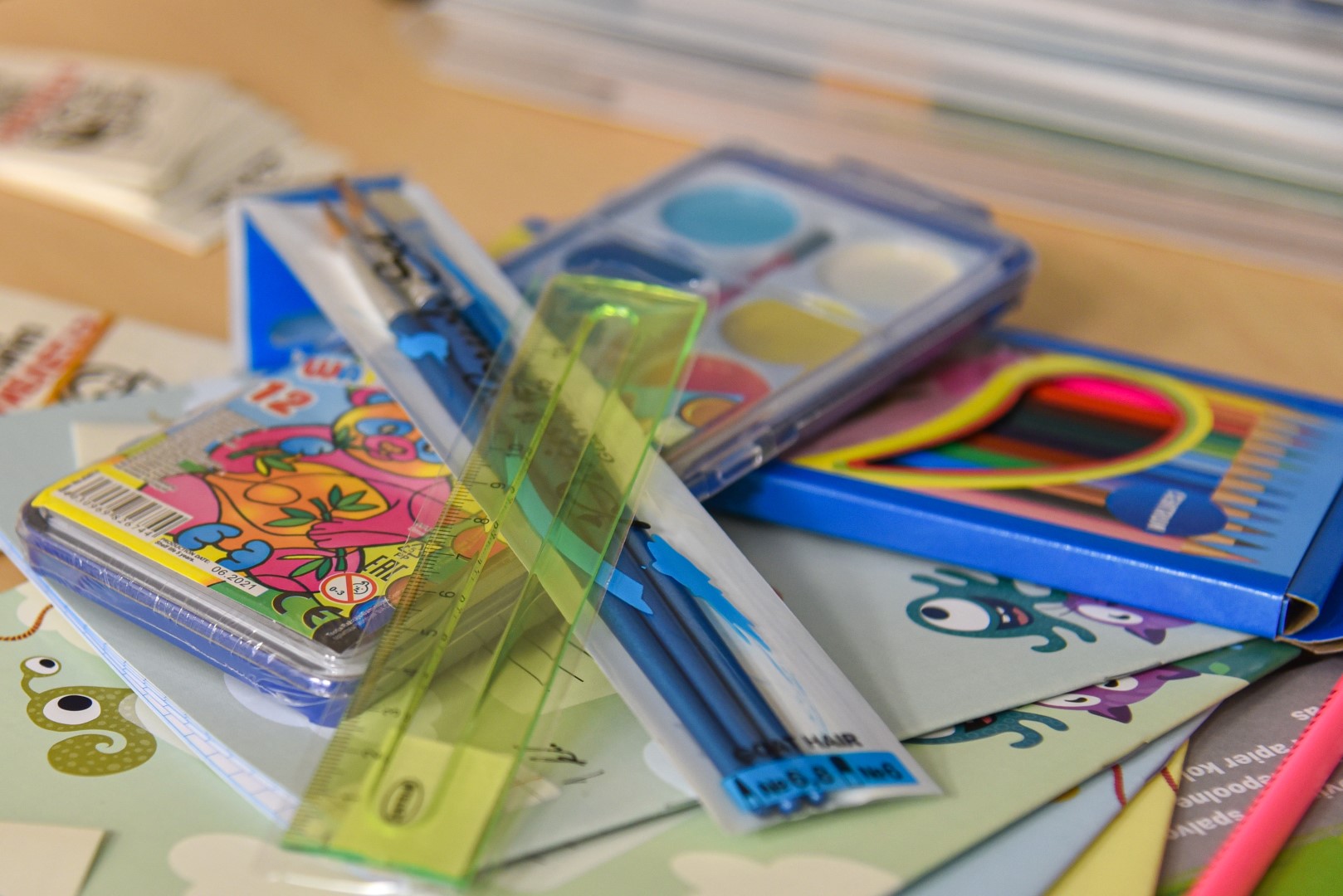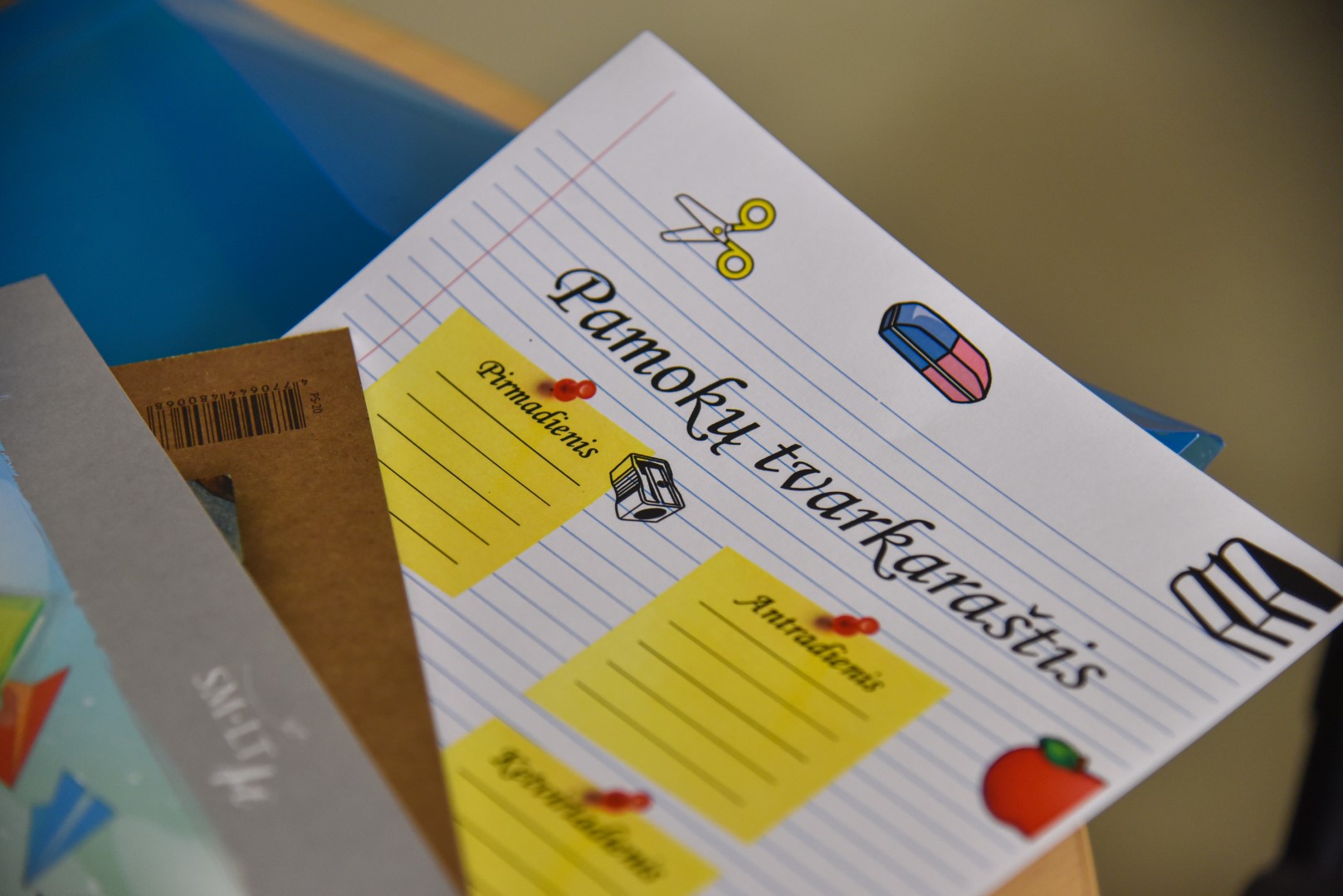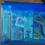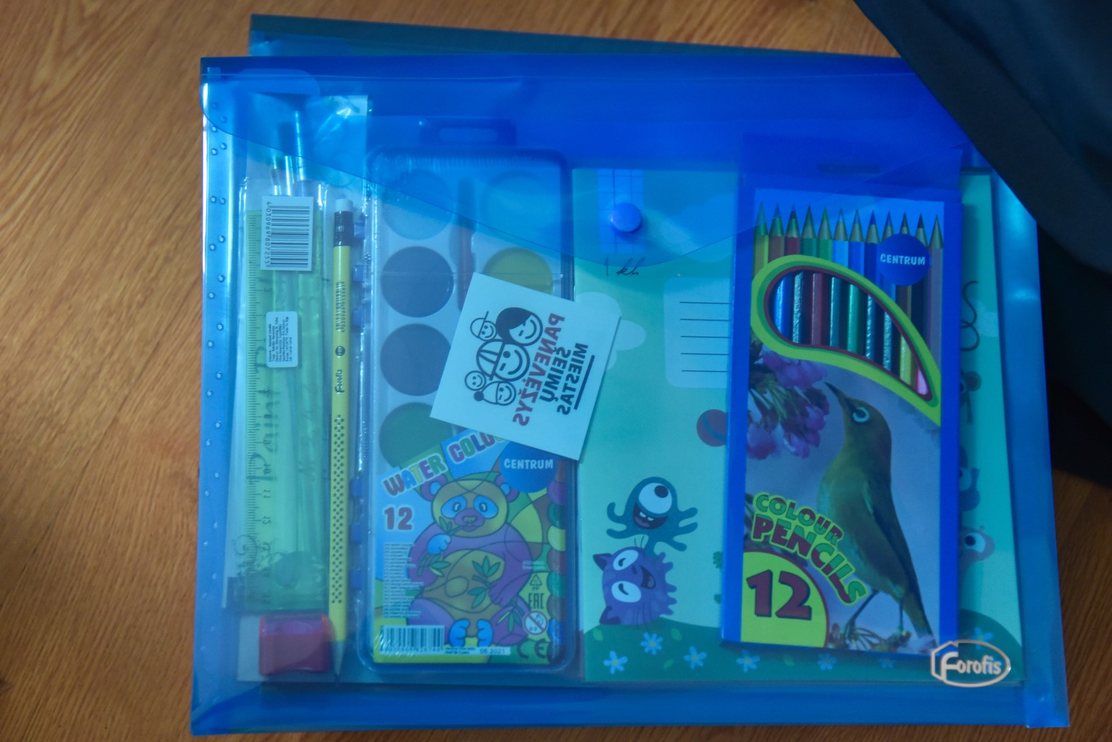 Į spalvingą aplanką buvo sudėtos visos reikalingiausios mokyklinės priemonės sėkmingam mokyklos startui: sąsiuviniai, spalvotas popierius, drožtukas, pamokų tvarkaraštis, piešimo sąsiuvinis, spalvoti pieštukai, akvarelė, teptukai, liniuotė.