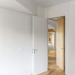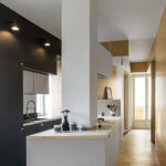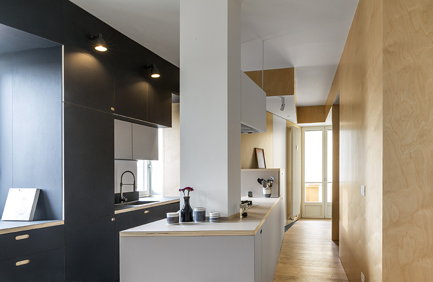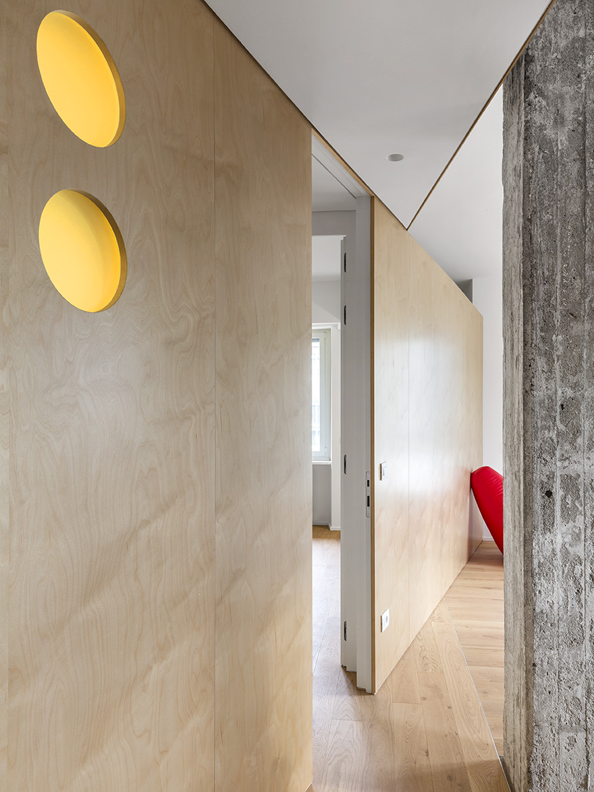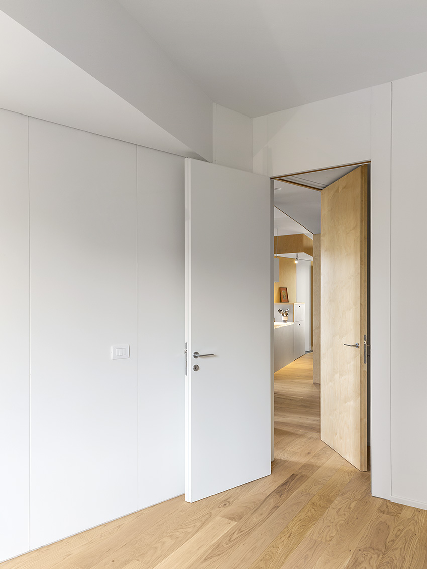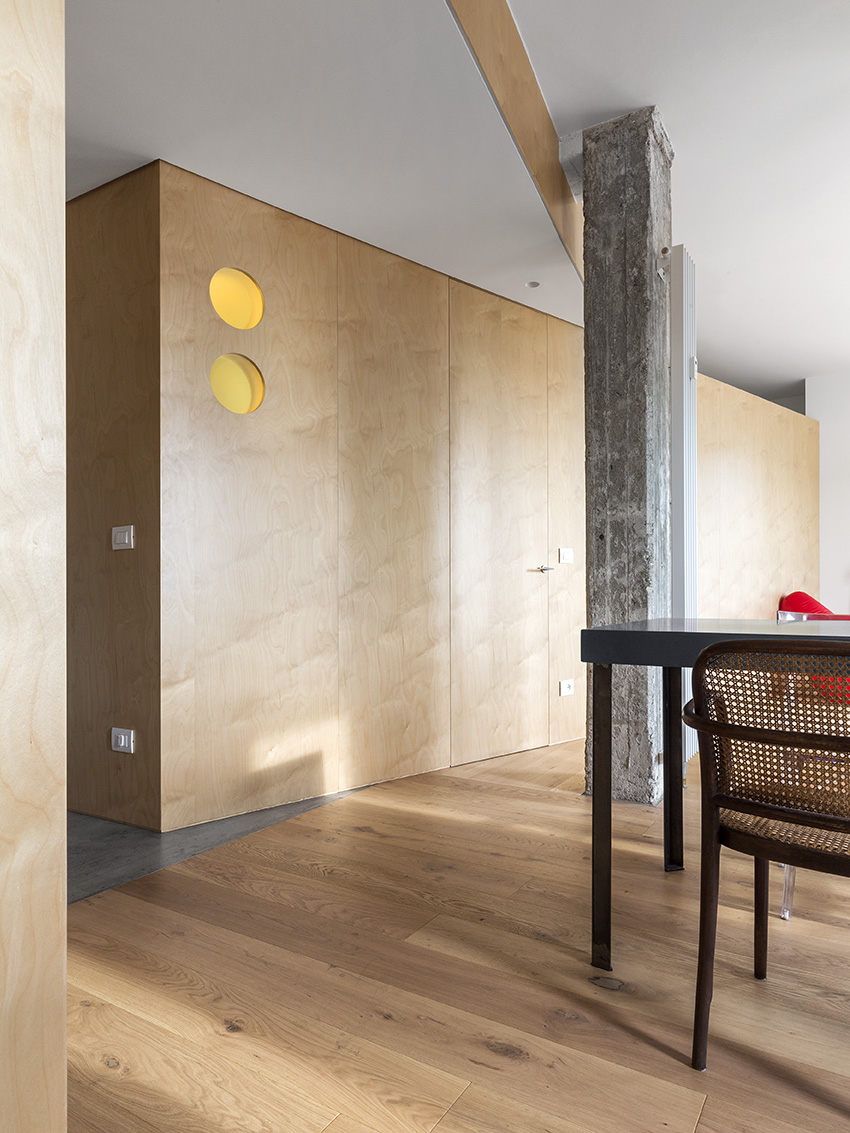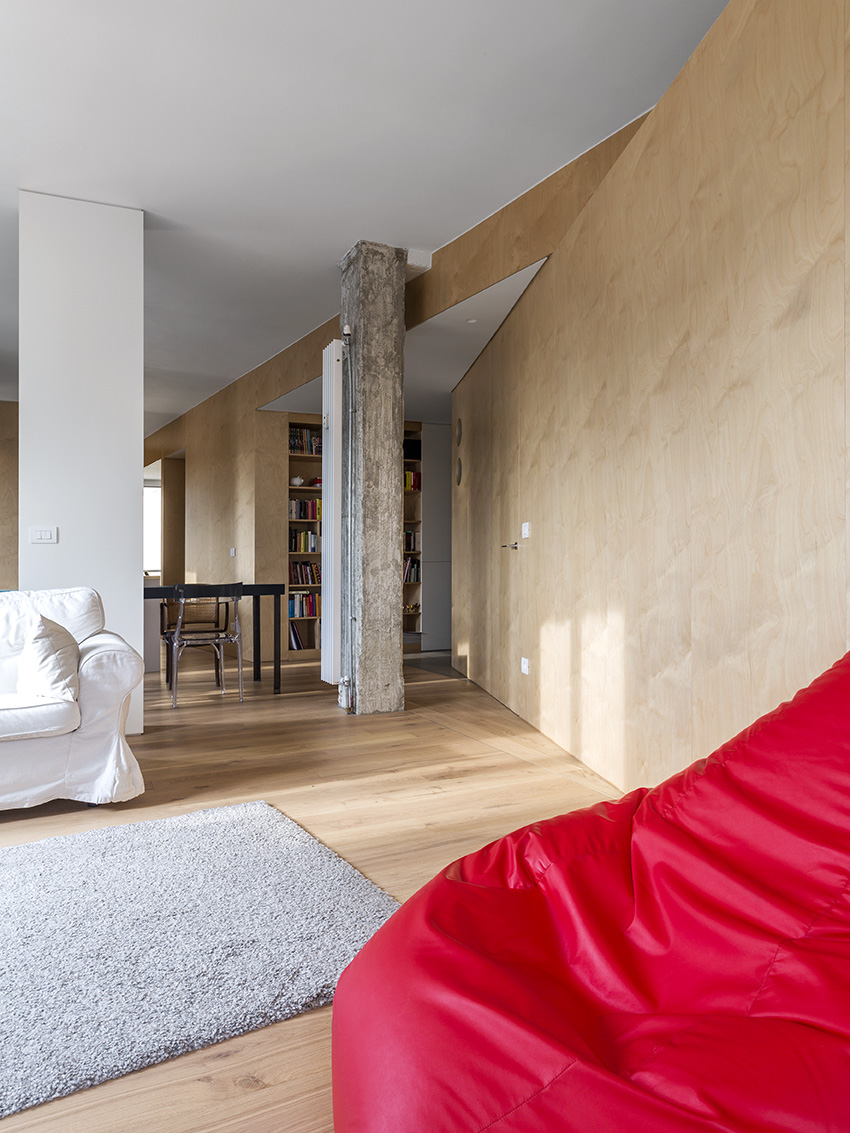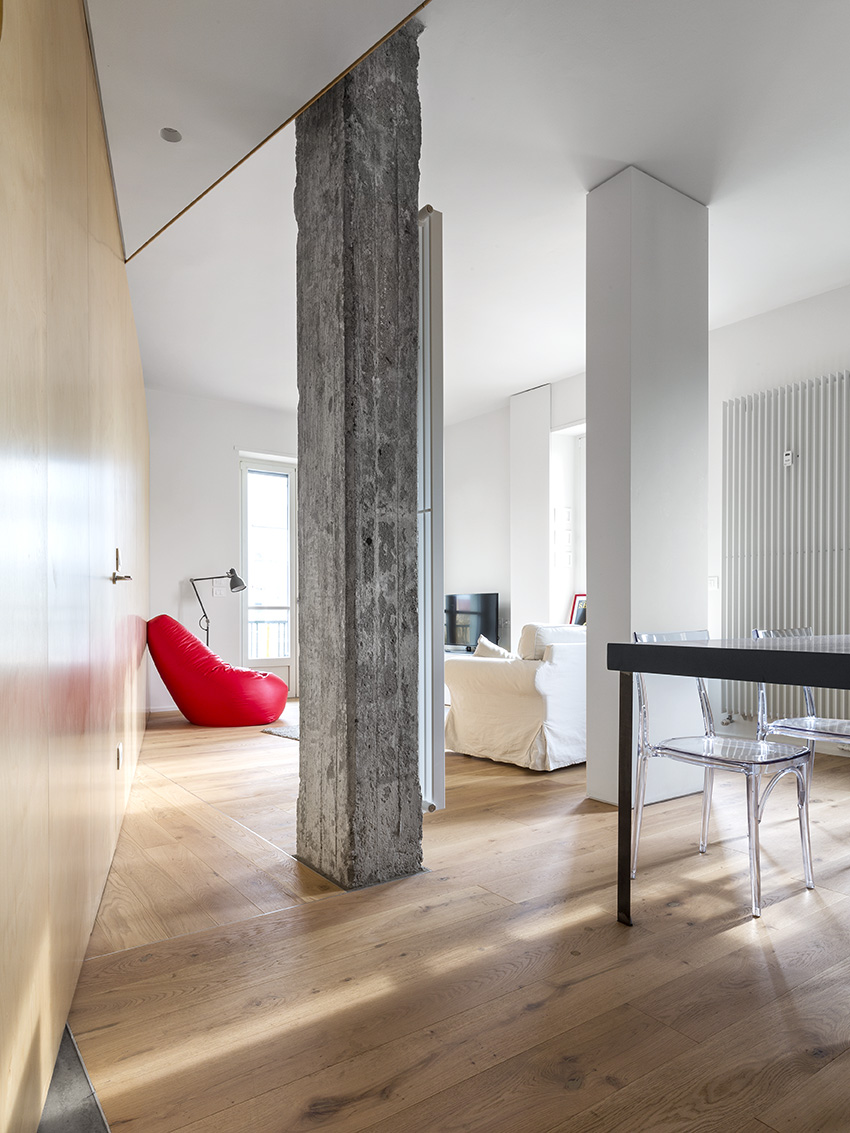 Dvi naujos ilgos įstrižos pertvaros butą dalina į dvi zonas – gyvenamąją ir poilsio. Vienu didžiausių naujo plano privalumų architektas J. Bracco’as vadina šviesą – blokuota ankstesnių pertvarų, dabar ji į butą patenka iš trijų pusių. Šį įspūdį sustiprina baltai dažytos sienos, šviesaus medžio pertvaros ir grindys.