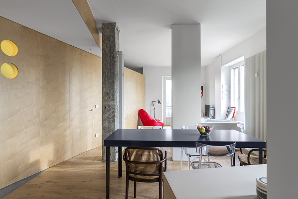 Buto erdvumą pabrėžia kartu su pertvaromis projektuoti lakoniškų formų baldai. J. Bracco’as pasakoja, kad, jo ir komandos įsitikinimu, baldai nėra vien namuose naudojami daiktai. Jie – specialūs architektūriniai objektai, labai svarbūs įgyvendinant projektą. „Todėl į pertvaras ir baldus reikia žiūrėti kaip į vientisą komponentą, kuris, priklausomai nuo požiūrio, yra erdvę skaidantis arba funkcionalus objektas“, – akcentuoja vienas iš studijos „Blaarchitettura“ įkūrėjų.