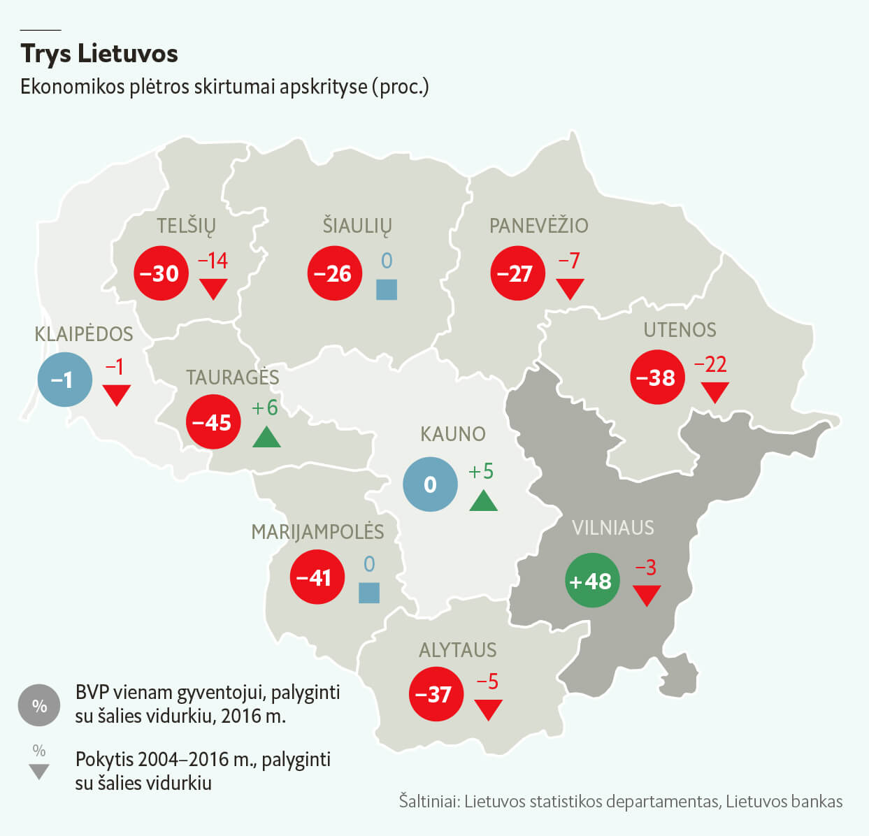 Kalbant apie regionų atskirtį mėgstama vartoti „dviejų Lietuvų“ terminą, bet iš tiesų turėtume matyti bent tris. Vertinant pagal vienam gyventojui tenkančią BVP dalį, į priekį pastebimai išsiveržusi Vilniaus apskritis – joje šis rodiklis 48 proc. viršija šalies vidurkį. Žinoma, ir čia galima rasti skurdo zonų, nes Statistikos departamentas duomenis pateikia pagal apskritis, o ne pagal atskiras savivaldybes. Kauno ir Klaipėdos apskrityse vienam gyventojui tenkantis BVP yra beveik lygus šalies vidurkiui, o likusiose septyniose – net 26–45 proc. mažesnis (žr. žemėlapį).
