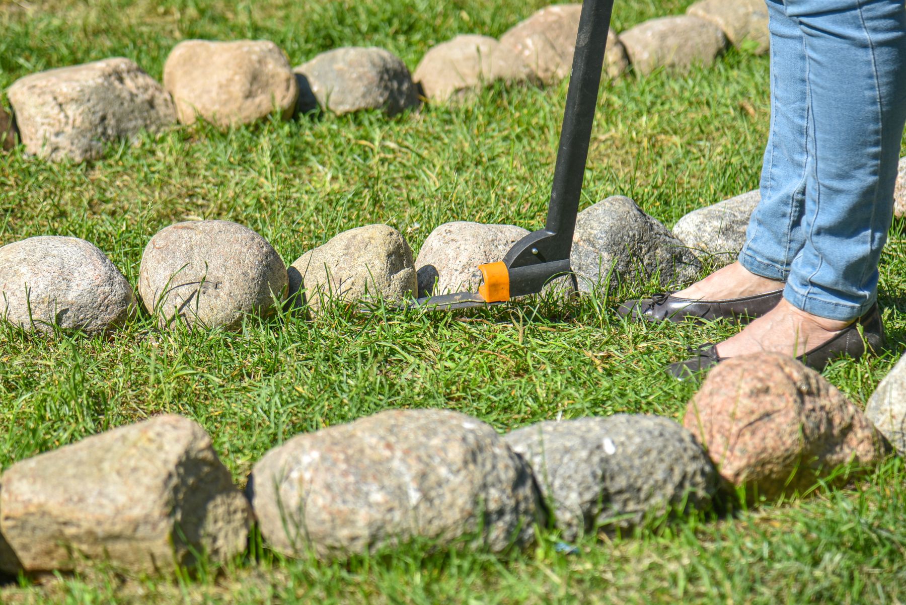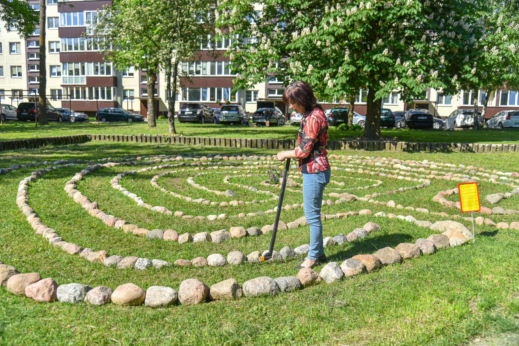 Kol iš Savivaldybės nesulaukė leidimo, Birutė neskuba pirkti žoliapjovės – visą labirintą apeina keliais, kol paprastomis žirklėmis nukarpo žolę.