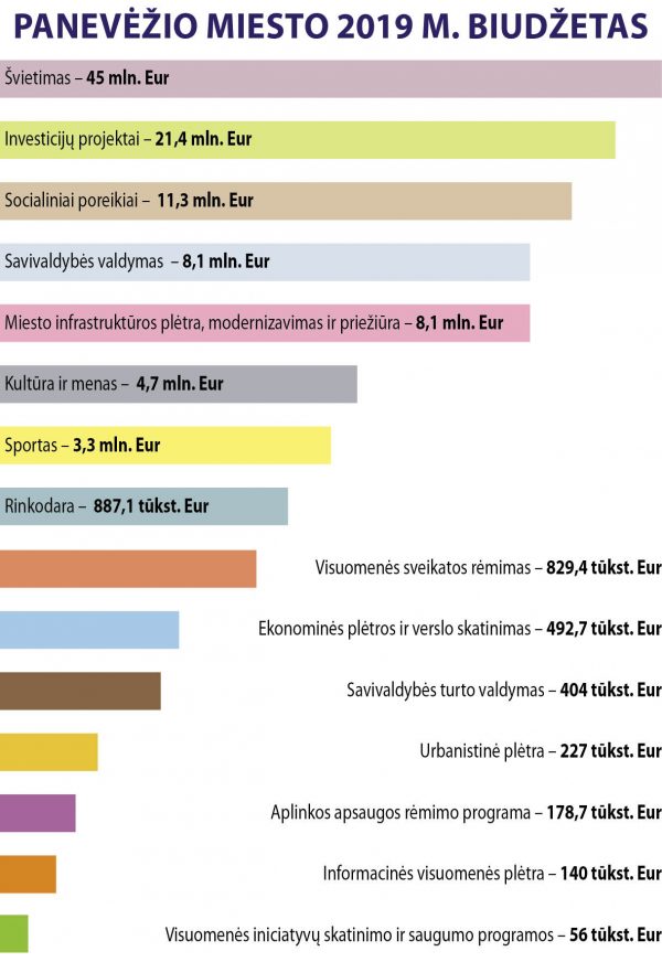 Šiųmečiame Panevėžio biudžete išlaidos išdalytos pagal penkiolika programų. Liūto dalis atseikėta švietimui, investiciniams projektams bei socialinėms programoms. Pagrindinį dėmesį ir investicijas skyrus europiniams projektams, dėl kurių šįmet Panevėžys turėtų virsti ištisa statybų aikštele, teko gerokai apkarpyti kitas biudžeto eilutes.