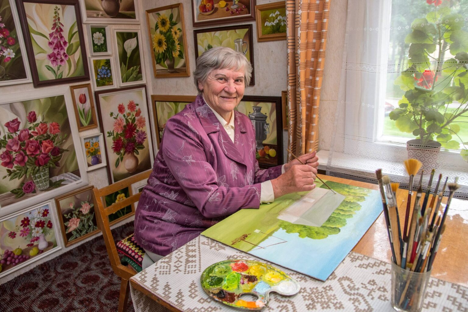 Savo privačiame name tarp daugiabučių ji, galima sakyti, turi visą paveikslų galeriją. Per šimtas darbų kaba jos dviejuose mansardos kambariuose. Viename jų ir pačios autorės dirbtuvės.