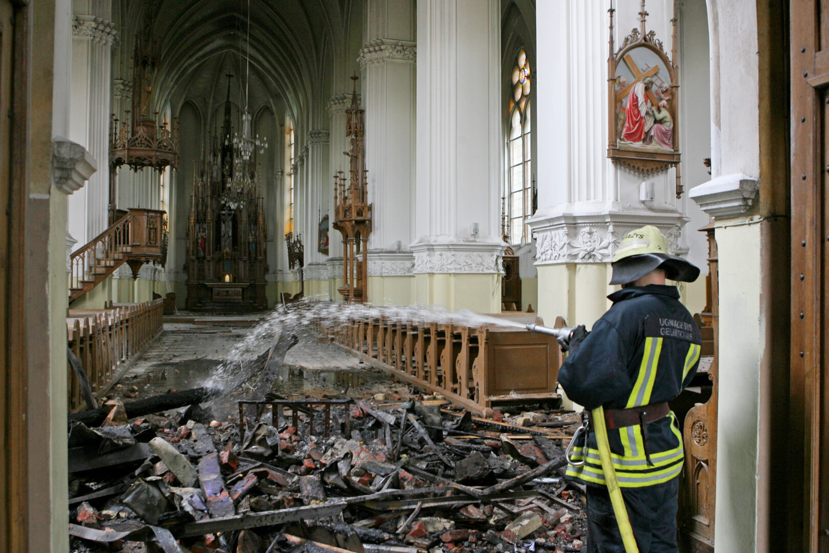 Gyventojai plikomis rankomis iš ugnies gelbėjo kas įmanoma – bažnytinius paveikslus, žvakides, kitus bažnytinius reikmenis.