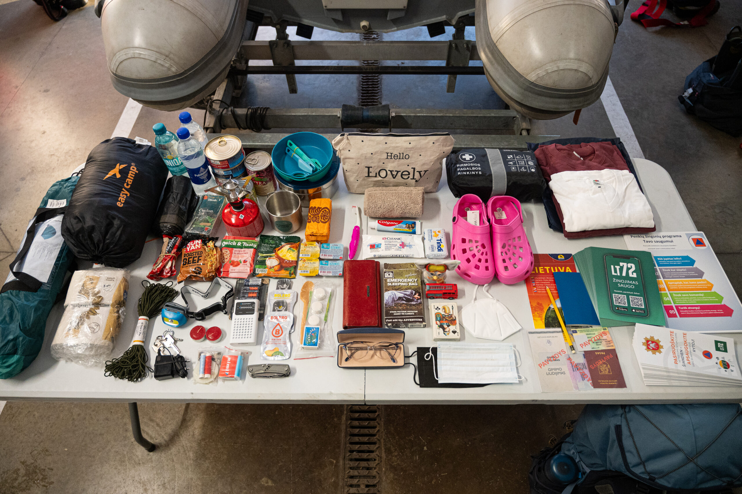 Pasak G. Gruodės, jame turėtų būti vandens ir maisto bent 72 valandoms, svarbiausi ir kasdien vartojami medikamentai, svarbūs dokumentai, radijo imtuvas, žibintuvėlis ar kitas šviesos šaltinis, įrankių rinkinys, higienos reikmenys, grynieji pinigai, šilta antklodė, atsarginiai drabužiai, o jei šeimoje yra vaikų – ir jiems skirti žaislai.