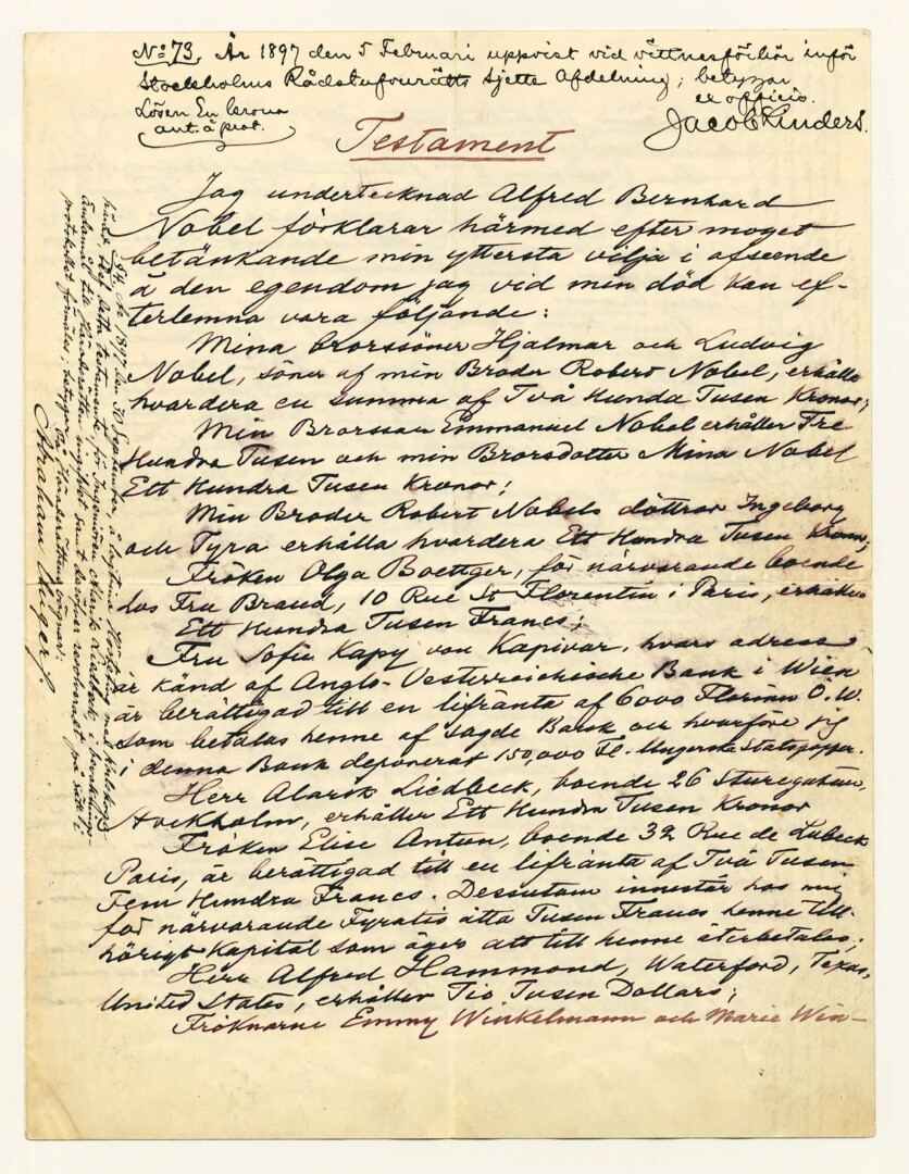 Pirmą sykį paskelbtas 1896-ųjų gruodį, praėjus kelioms dienoms po švedų chemiko, inžinieriaus, išradėjo, verslininko ir fabrikanto Alfredo Nobelio mirties, dokumentas sukėlė tikrą skandalą.