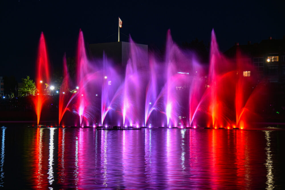 Net trisdešimties metrų ilgio plaukiojantis sinchronizuotas muzikinis šviesų ir projekcijų fontanas stebino pusvalandį trukusiu, tikrų tikriausiu spektakliu. Pagal iš anksto suprogramuotą algoritmą sinchronizuotai „šoko“ fontano srovės, grojo muzika, keitėsi povandeninis srovių apšvietimas.