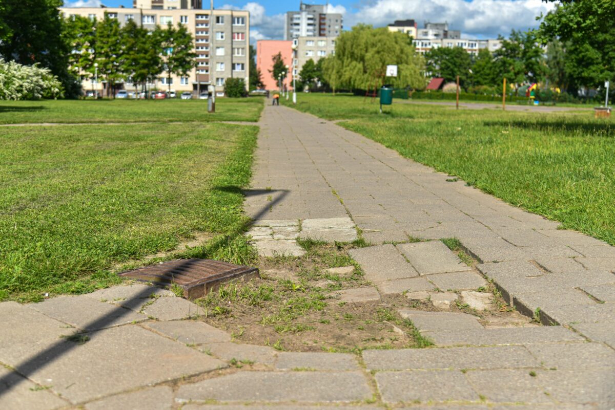 Anot P. Želvio, kai šaligatvis buvo užžėlęs, išties neestetiškai atrodė, tačiau dabar, kai teritoriją prižiūrinti moteris kruopščiai išravėjo tarp plytelių augančias žoles, takas pasidarė nesaugus. Vietomis tarpai tarp plytelių siekia net iki dešimties centimetrų.