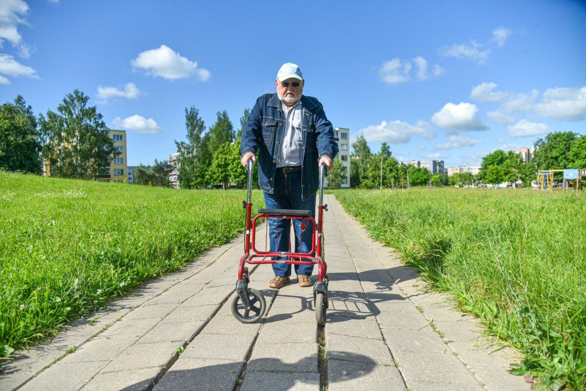 Molainių gatvės daugiabutyje gyvenantis į devintą dešimtį kopiantis Petras Želvys „Sekundės“ žurnalistus pakvietė pasivaikščioti pagrindiniu šaligatviu, vedančiu į „Šaltinio“ progimnaziją. Anot senjoro, šiuo taku bent jau prieš karantiną kasdien vaikščiodavo mokiniai, tačiau ir dabar nemaži pėsčiųjų srautai. Jis pats paeina tik su vaikštyne. Su tokia „pagalbininke“ pereiti šaligatvį – didelė bėda: plytelės išsiklaipiusios, sulaužytos, o vietomis tarp jų tarpai tokie, kad ne tik jo vaikštynės kojelės kliūna, bet ir dviračių ar paspirtukų ratai stringa.