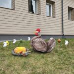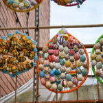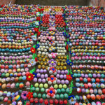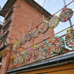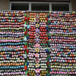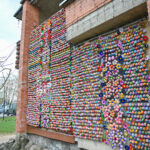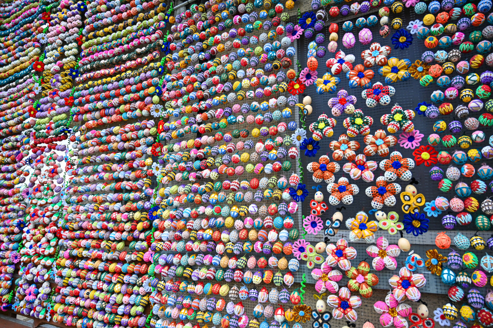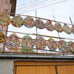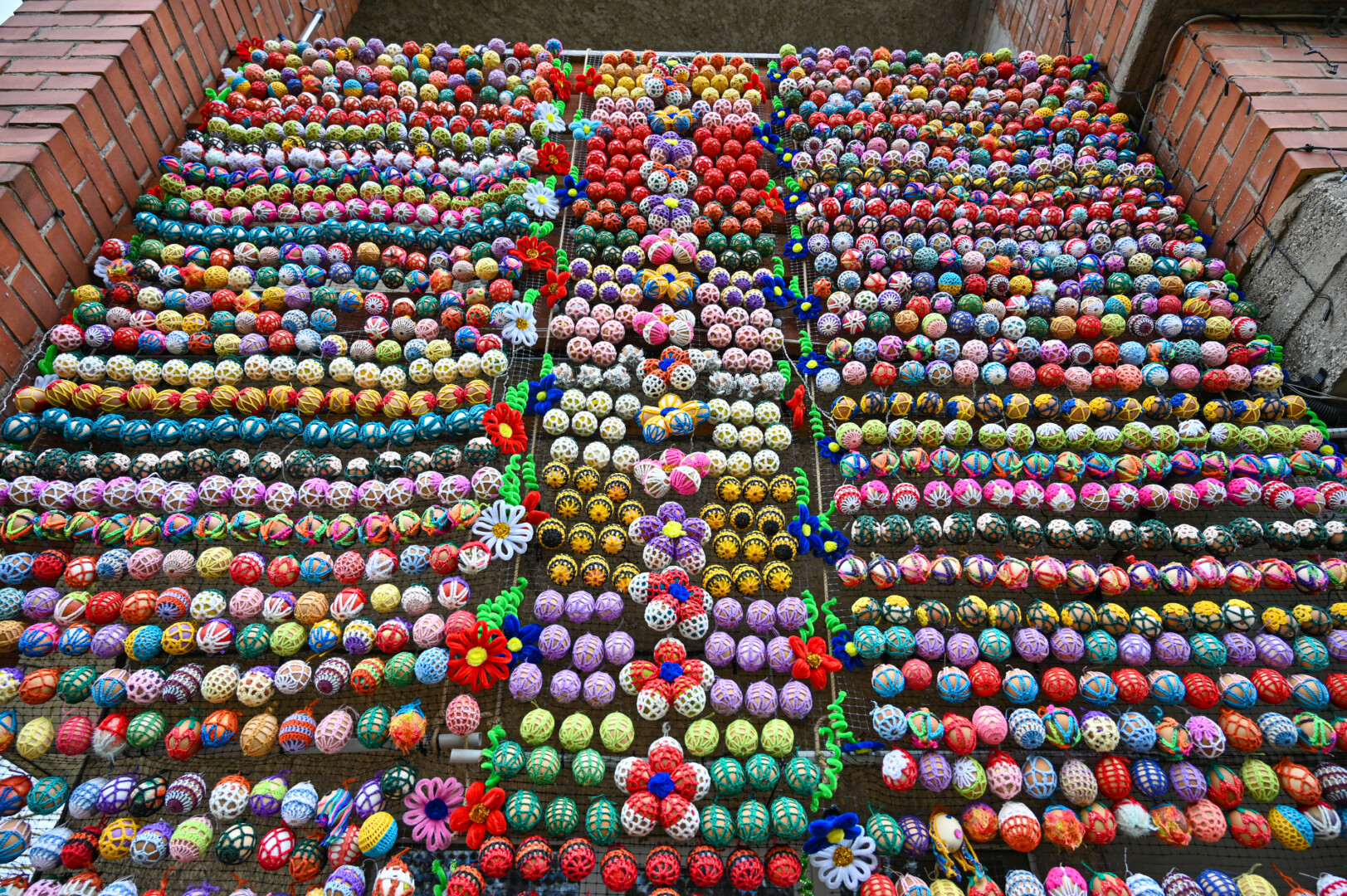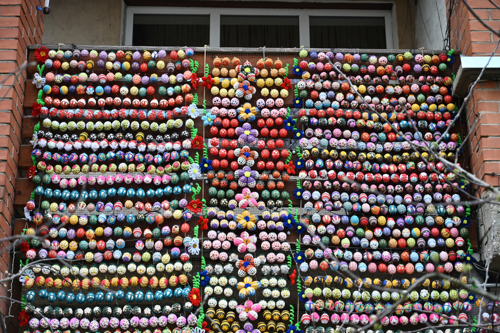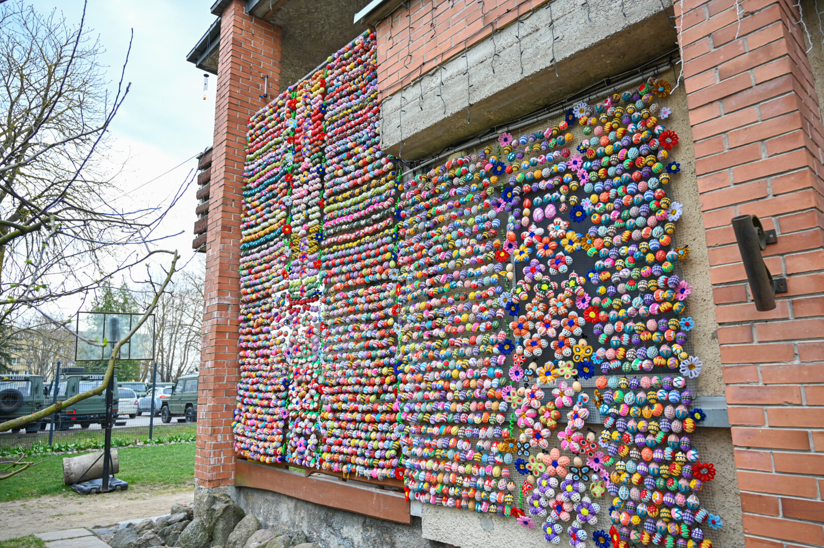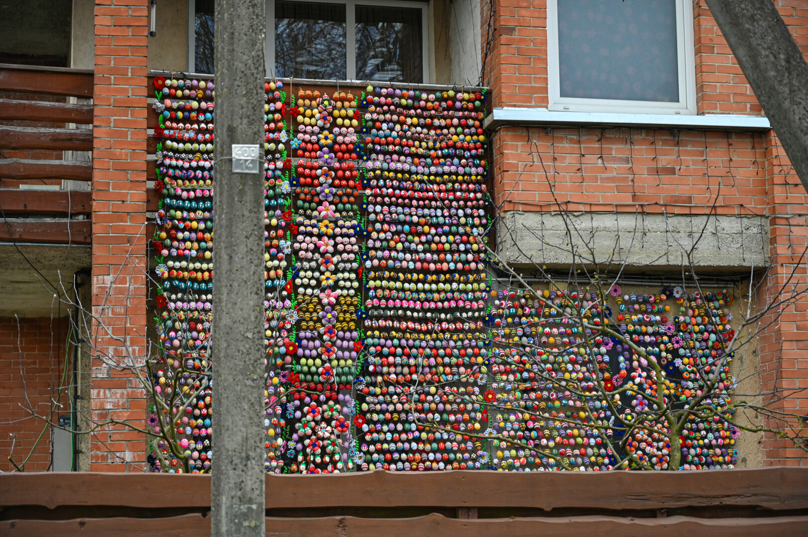 Šįmet kiemui papuošti ji panaudojo ne tik pernai sukurtas dekoracijas – margučius, sujungtus į masyvias figūras, bet ir surišo savotišką margučių užuolaidą.