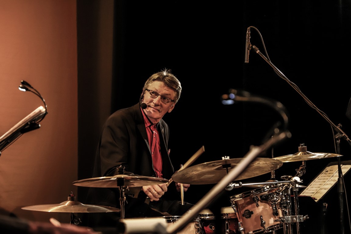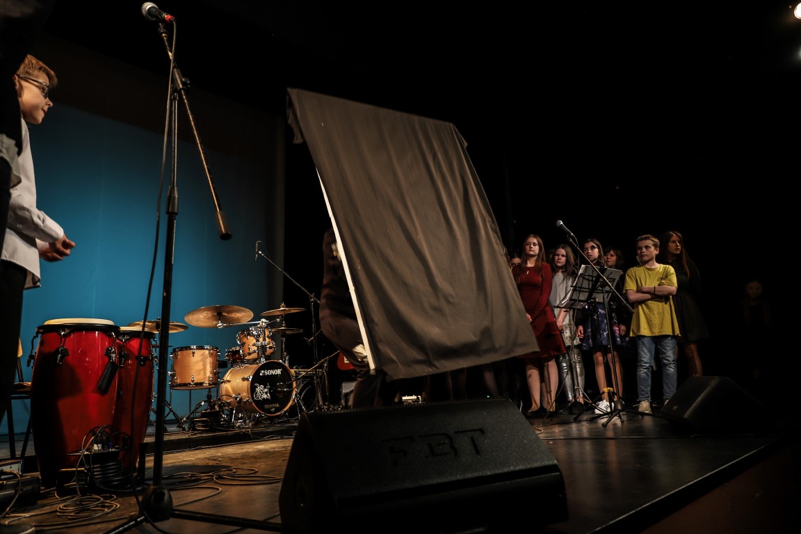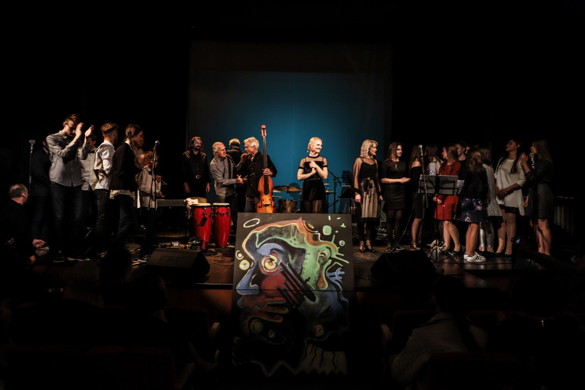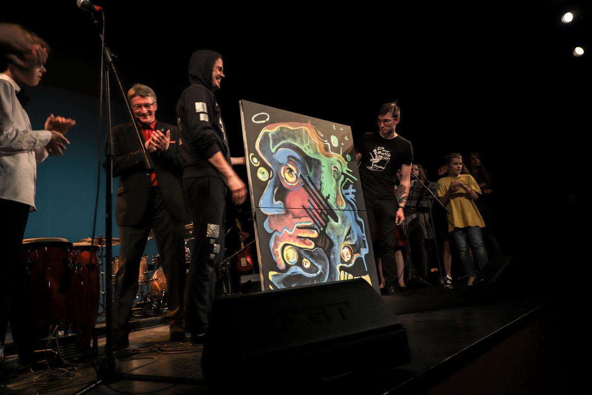 Scenoje džiazavo ne tik mokiniai ir jų mokytojai. Prie programos prisijungė ir teatro aktoriai bei dailininkas, scenografas, fotografas Arvydas Gudas. Jis, skambant džiazo melodijoms, kūrė paveikslą, kurį paviešino renginio pabaigoje.
