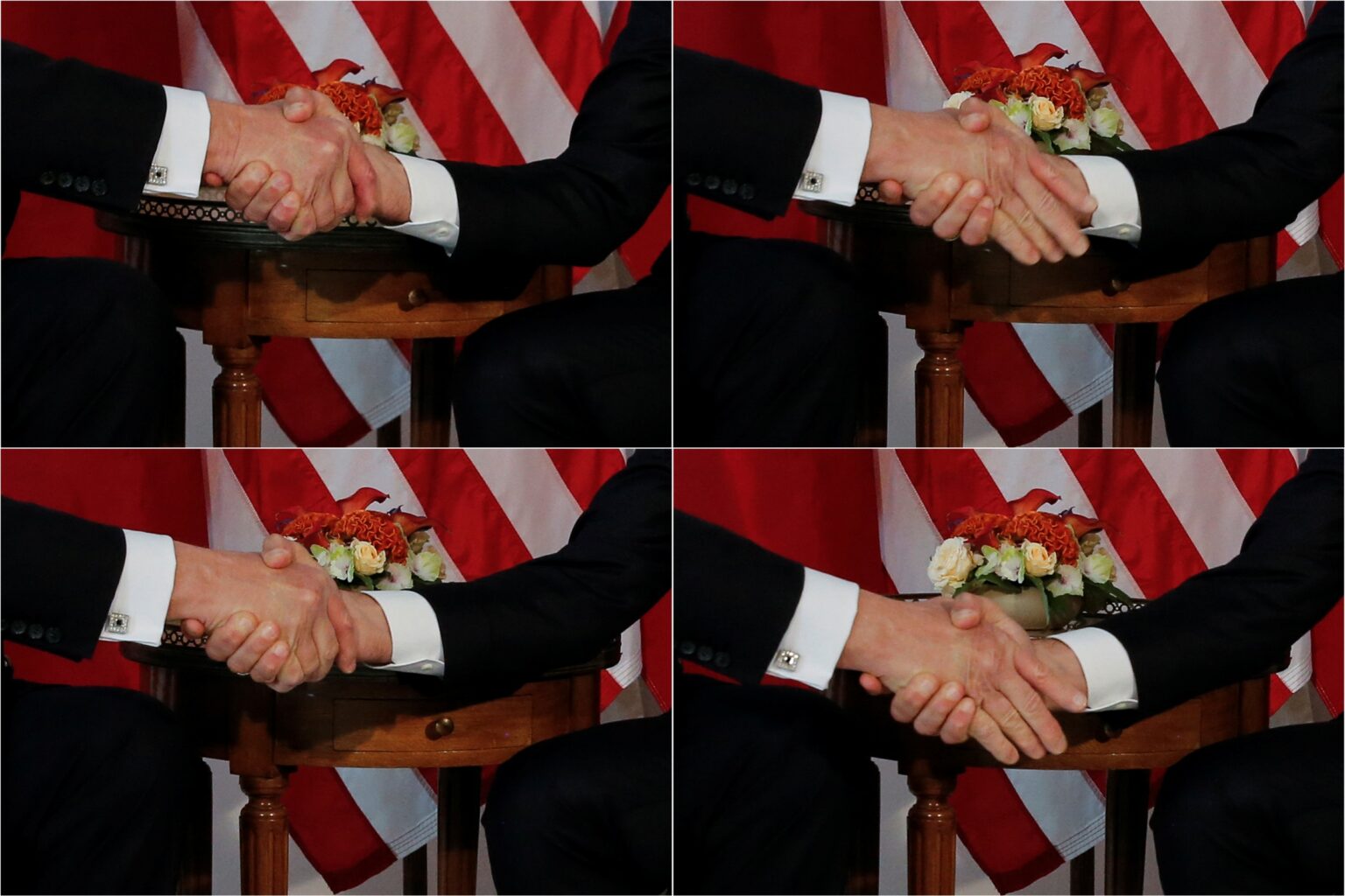 JAV prezidentas jau atrodė norįs paleisti ranką, bet Prancūzijos lyderis dar kelias akimirkas ją laikė sugniaužęs. Matėsi, kad tuo metu jie abu smarkiai sukando dantis.