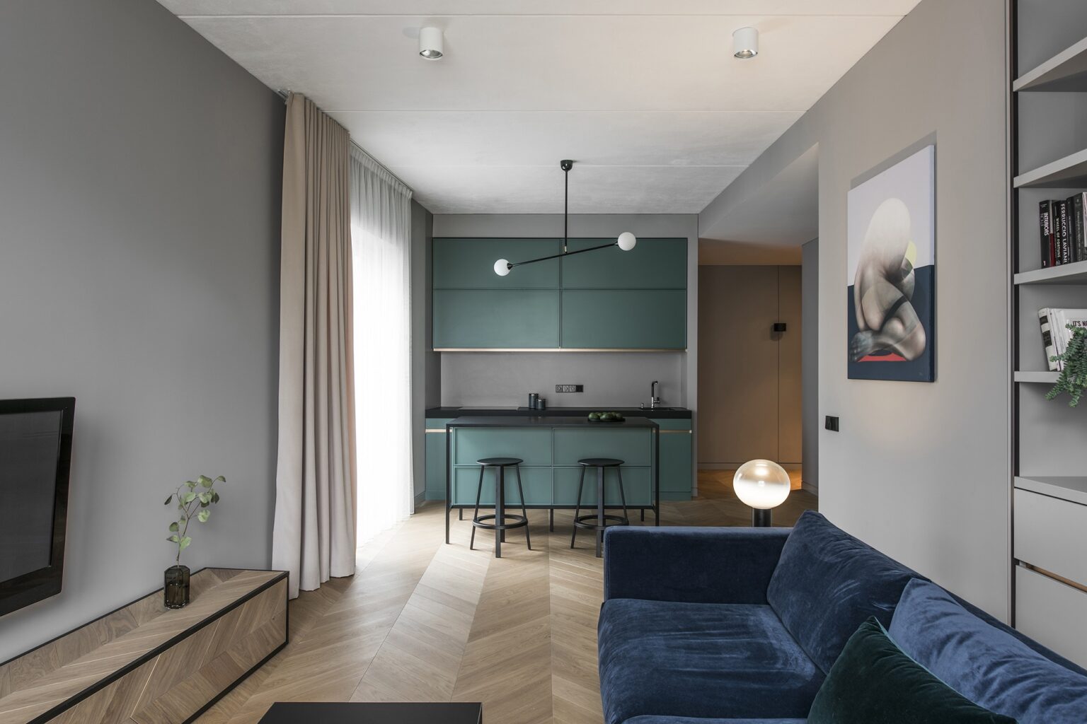 Neįprastos tamsiai žalios spalvos virtuvės komplektas, sodriai mėlyna aksominė sofa, jauno danų menininko Johno Reusso tapybos darbas.