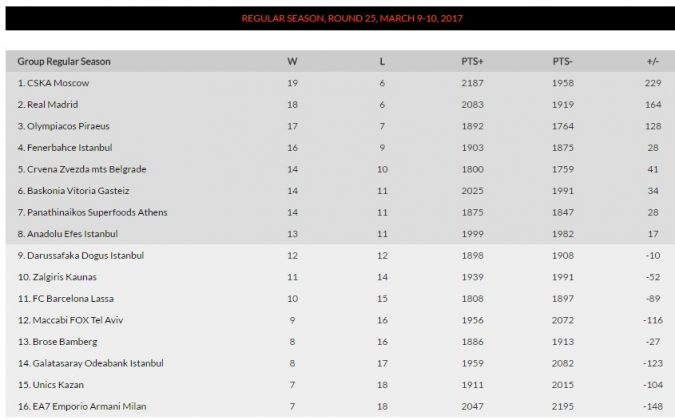 „Žalgiris“ Eurolygoje su 11 pergalių ir 14 pralaimėjimų užima dešimtąją vietą.