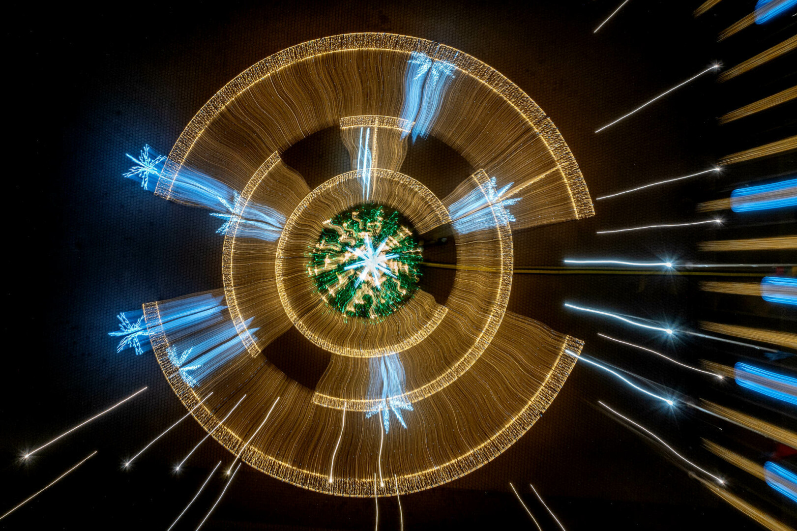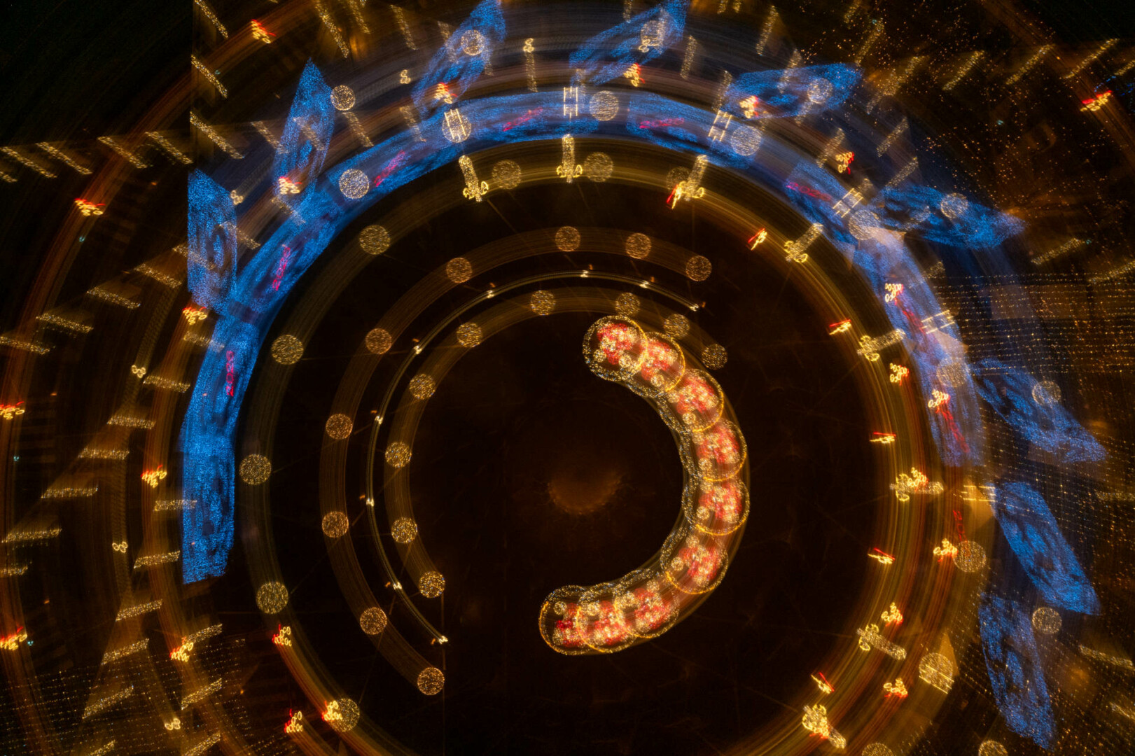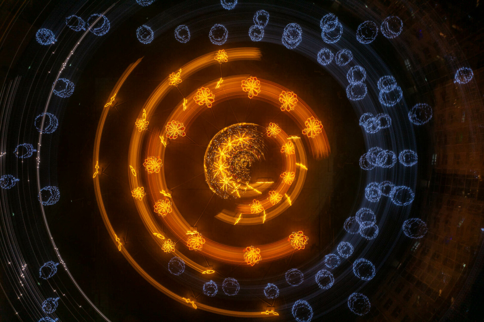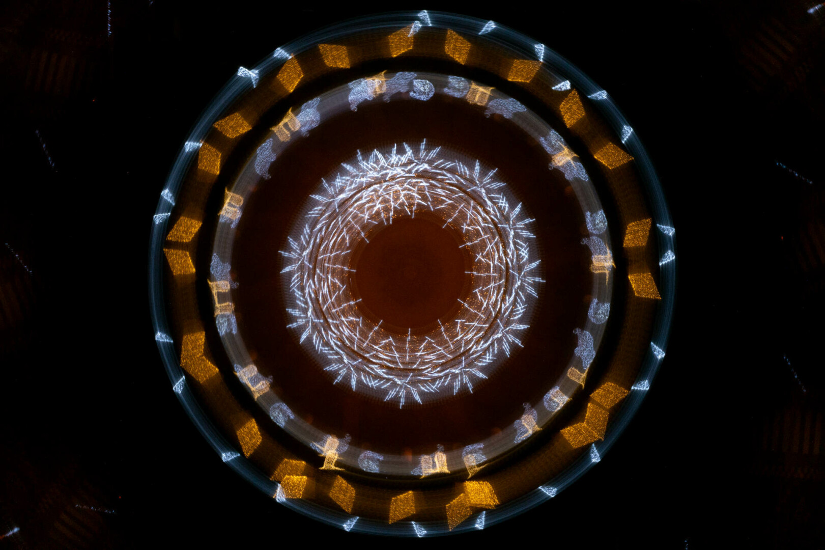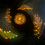 Anot fotomenininko, šis fotografijų ciklas kviečia sustoti ir pažvelgti į šventinę erdvę kitaip – ne kaip į dekoraciją, o kaip į procesą, kuriame šviesa, judesys ir laikas susilieja į naują vizualinę patirtį. „Šviesa. Mandalos“ yra ankstesnio ciklo „Šviesa“ tęsinys, kuriame žvilgsnis sąmoningai sutelkiamas į apskritimą – formą be pradžios ir pabaigos, pasikartojančią, grįžtančią, pulsuojančią.