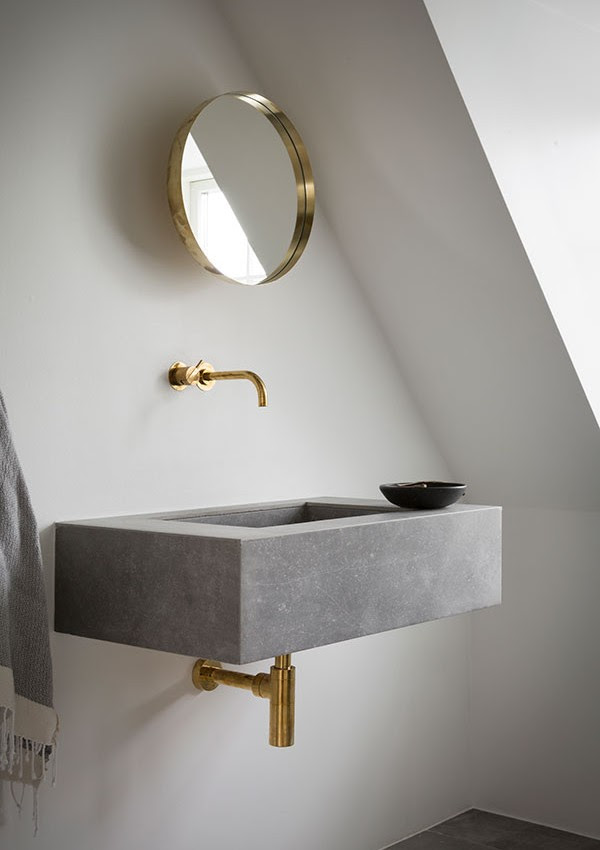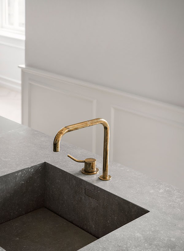 Minimalistinėje ąžuolinėje virtuvėje su žalvarinėmis rankenomis stovi skulptūrinė sala, padengta šviesiai pilka keramika. Tiek virtuvėje, tiek vonioje įtaisyti nedideli žalvariniai vandens maišytuvai.