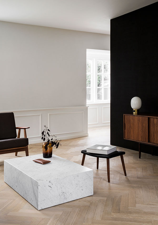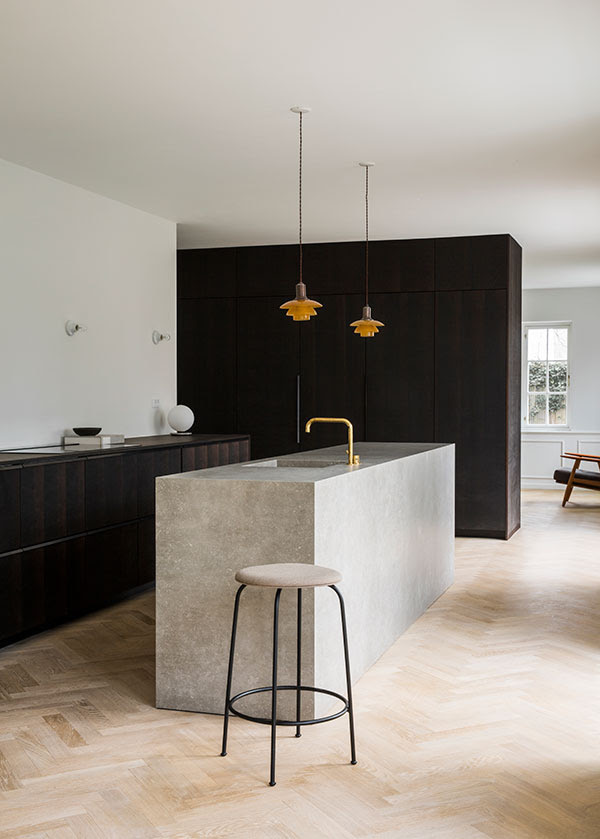 Vedini švarumo ir minimalizmo idėjos, namą atstatę architektai atkūrė klasikinius elementus ir priderino juos prie modernių detalių. Taip buvo sukurtas laikui nepavaldus ir šiltas interjeras. Tamsūs praėjusio amžiaus vidurio tikmedžio baldai ir minimalistinės marmurinės detalės sukuria gražų kontrastą, išryškindamos švarų ir subtilų lygių baltų sienų bei tamsaus ąžuolo virtuvės puošnumą.