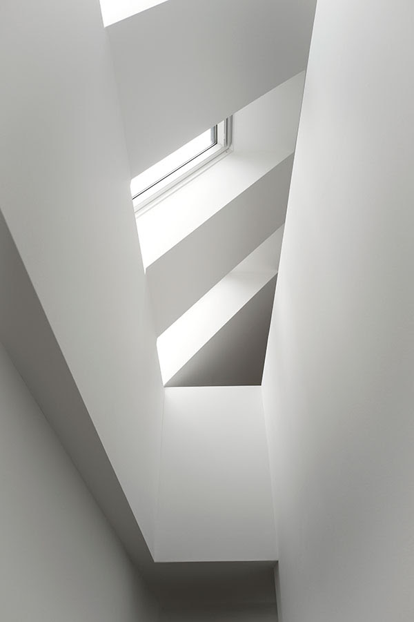 Kabantys ąžuoliniai laiptai – moderni jungiamoji grandis, einanti nuo rūsio iki antro aukšto. Juos apšviečia pro stoglangius krentanti šviesa, tad erdvė sukuria namų erdvumo pojūtį.