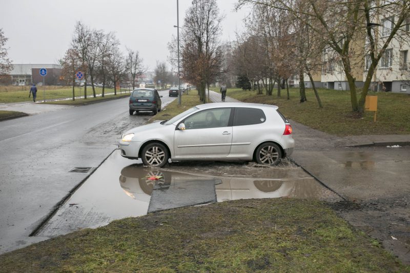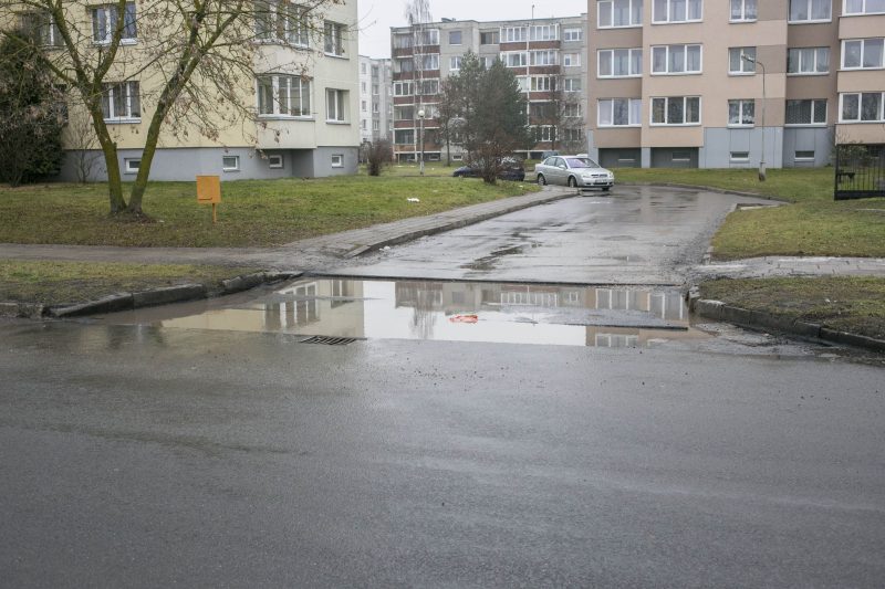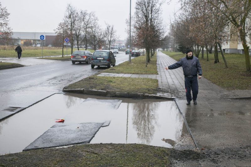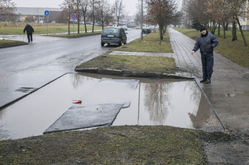 „Norint iš tų griovių išsukti į gatvę, reikia spustelėti greitį. Mašina šokte užšoka ant asfalto. Šitaip ir žmonių gyvybėmis rizikuojama. Suprantu, kad kai taip šlapia, tokių balų niekas neužasfaltuos, bet kas bus pašalus. Tada ledu važiuosim“, – baiminasi K. Bitėnas.