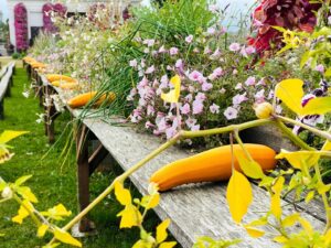 „Šią vasarą festivalyje atradome daržoves kaip galimą floristinio grožio etaloną, jos neįtikėtinai praturtino gėlių kompozicijas. Ypač dabar, rudenį, net labiau nei gėlės, gėlynuose akį traukia nokstantys įvairiaspalviai pomidorai, žemuogės, dydžiu stebina cukinijos, moliūgai, ryškūs burokėlių (mangoldų) ir masyvūs rabarbarų lapai, tarp gėlių puikuojasi krapai, įvairūs kopūstai, itin įspūdingai atrodo dygliuotieji artišokai“, – pasakoja dvare vykstančių gėlių festivalių sumanytoja ir kūrėja Kristina Ivančenko. „Su tokia gausa daržovių, vaisių, gėlių, smilgų ir įvairių žolinių augalų gėlynuose norime įkvėpti lankytojus eksperimentuoti savo gėlynuose, o pas mus kasdien, ypač dabar, rudenį, kai noksta daržovių derlius, išvysti galutinį, kupiną daržovių grožio gėlynuose rezultatą. Šią vasarą pamatėme ir parodėme, kad daržovių gėlynuose idėja ir šis eksperimentas teigiamai nustebino ir mus, ir mūsų lankytojus, bei patvirtino, kad ir ateityje daržovės vis dažniau atras vietą mūsų darželiuose, gėlynuose ir alpinariumuose, – priduria ji.