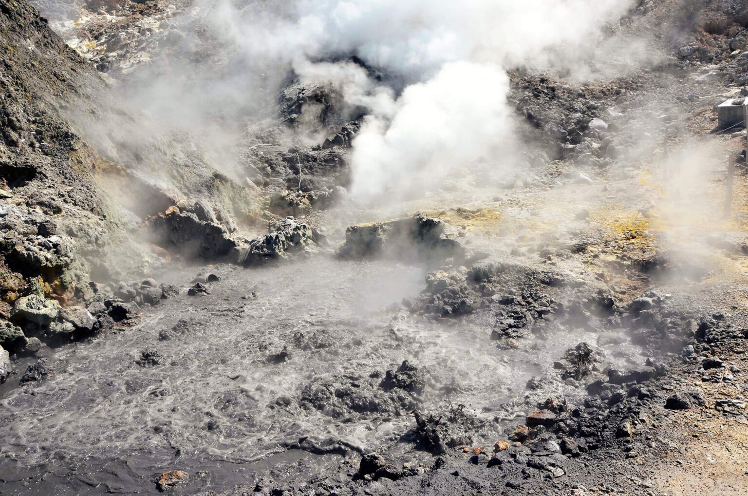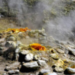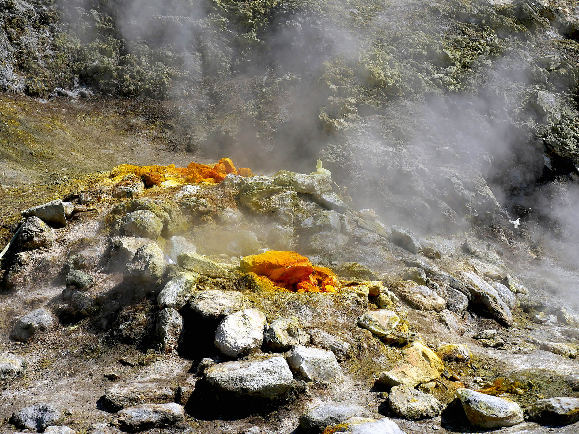 V. Morra, kuris taip pat koordinuoja Italijos ugnikalnių rizikos komitetą, pirmas nužingsniavo takeliu link nedidelės uolėtos daubos. Pasukus už kampo triukšmas sustiprėjo. Jis priminė milžinišką krioklį arba kokią nors pragaro mašiną. Priešais išvydau šio garso šaltinį – didžiulį garų srautą, kylantį iš properšos pilkose uolose. Po šiuo plyšiu raugėjo ir kunkuliavo suplakto urvo telkinys. Greta nebuvo jokios augalijos, o žemė po kojomis atrodė karšta. Žvelgėme į tai, ką vulkanologai vadina fumarolėmis. Karštis kilo iš magmos telkinio, susikaupusio maždaug 3 km gelmėje.