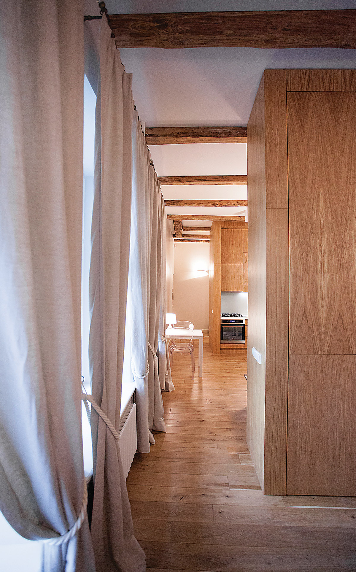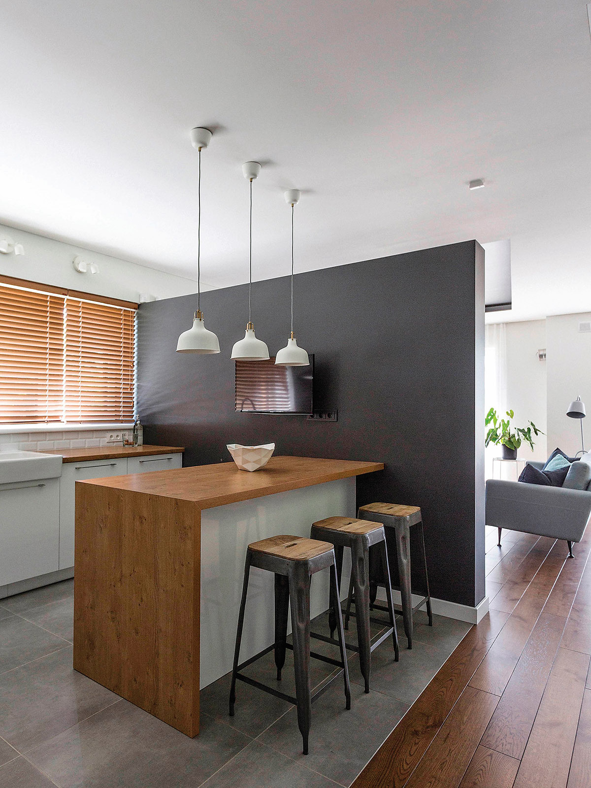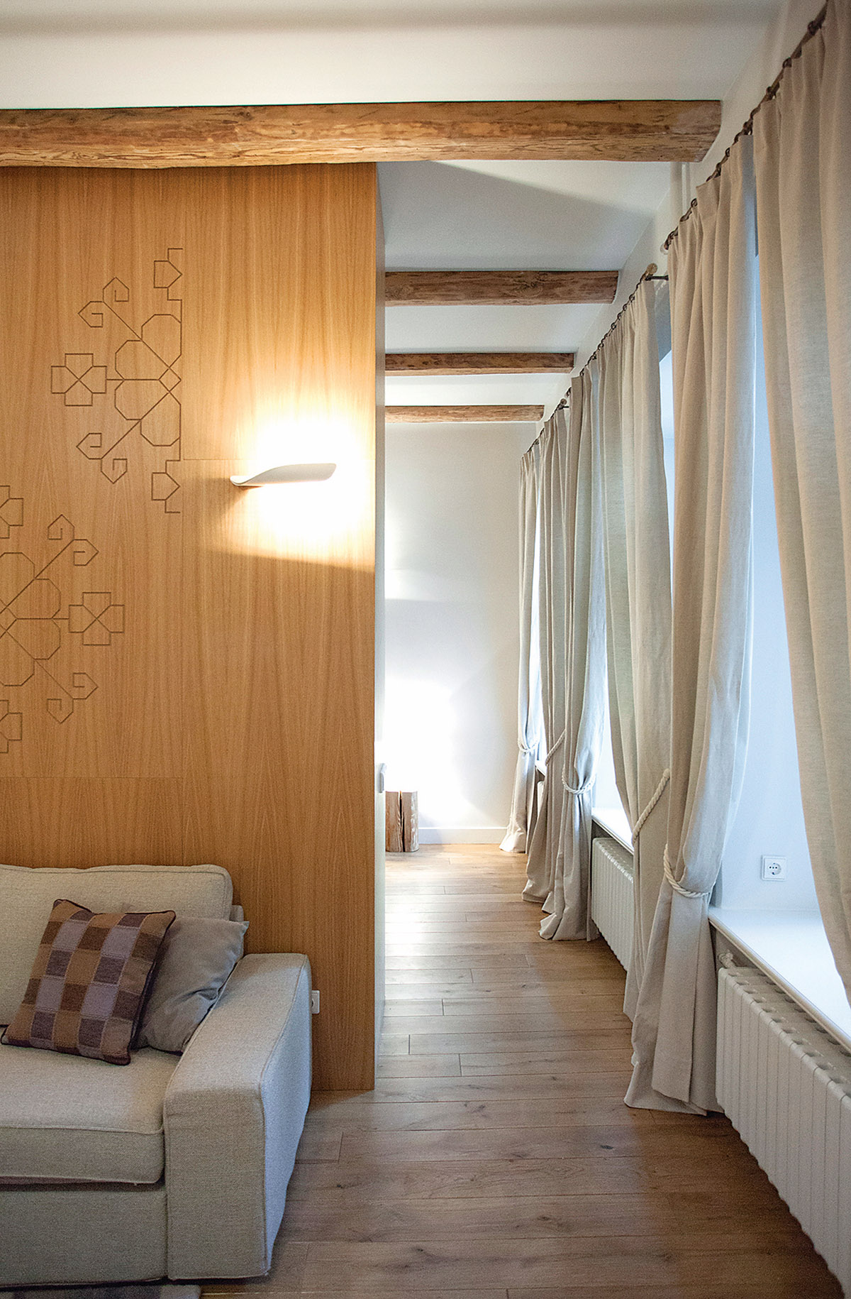 Paprašyta pakonsultuoti, kaip galima būtų racionaliau pertvarkyti erdves, viena interjero dizainerė pasiūlė išardyti naujai sumontuotas sąramas – praėjimų aukštis nebuvo simetriškas langų aukščiui! Namo šeimininkams ši detalė buvo mažiausiai svarbi, jie norėjo kitokių patarimų, kurių tuo metu negavo. Tikimės, kad šie patarimai padės ne vienam, galvojančiam, kaip pertvarkyti vidaus erdves.