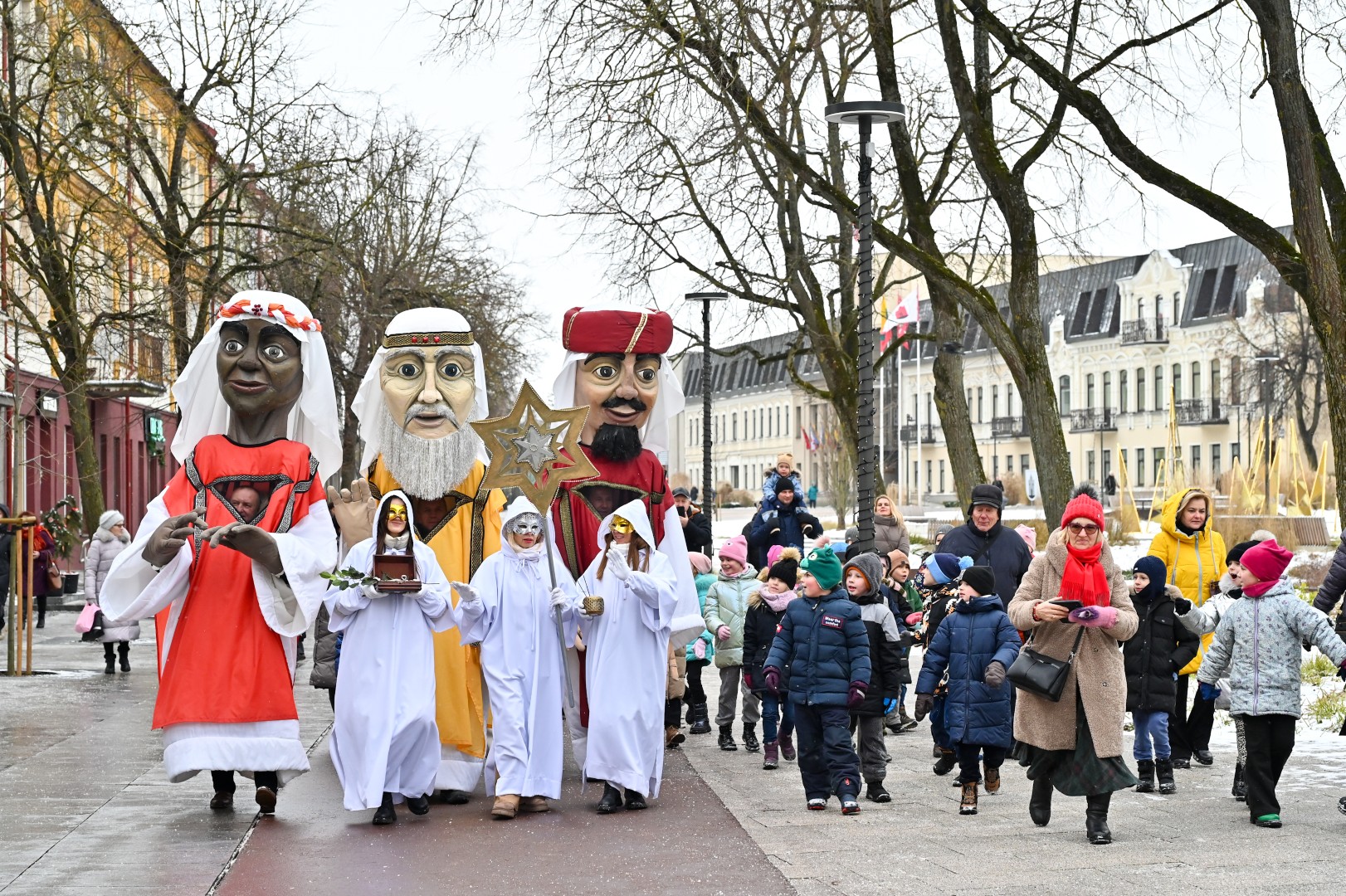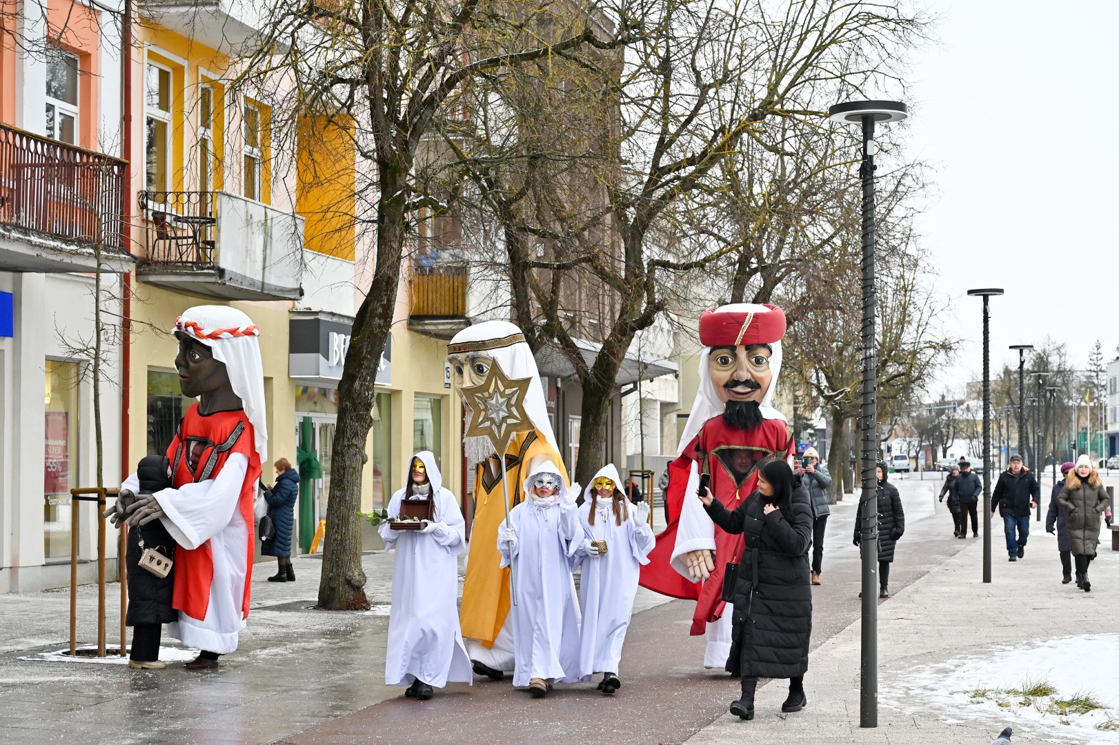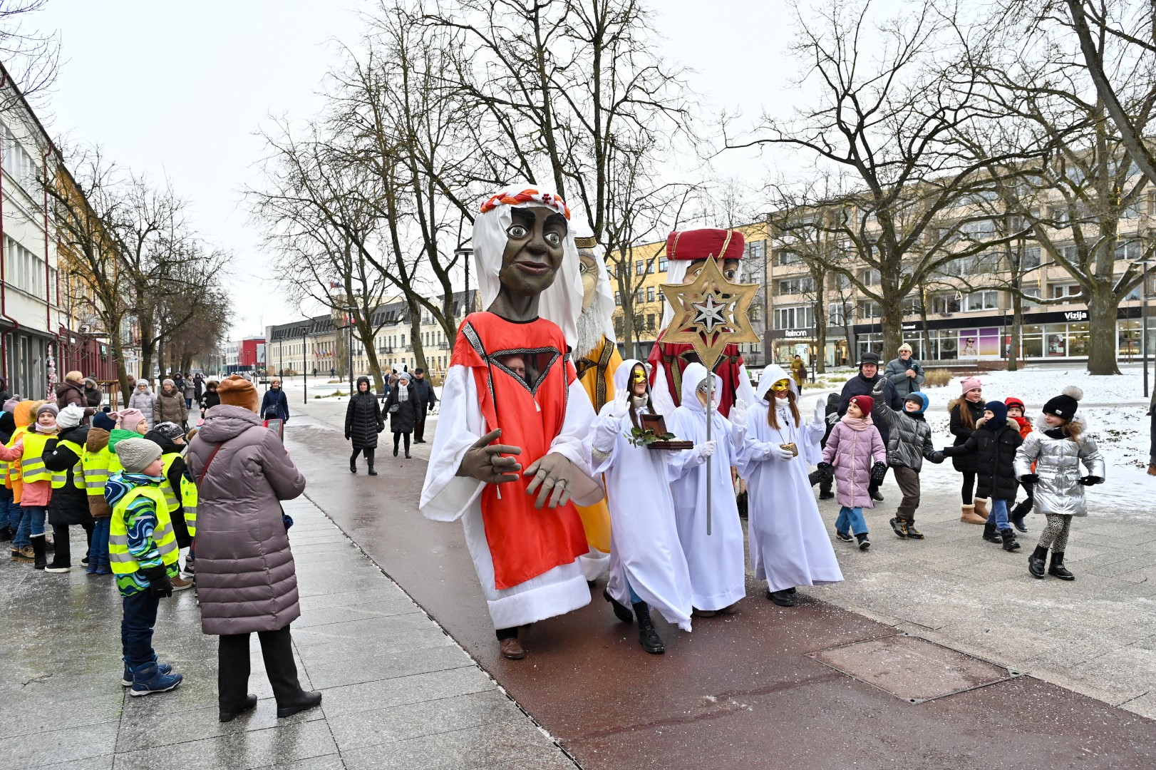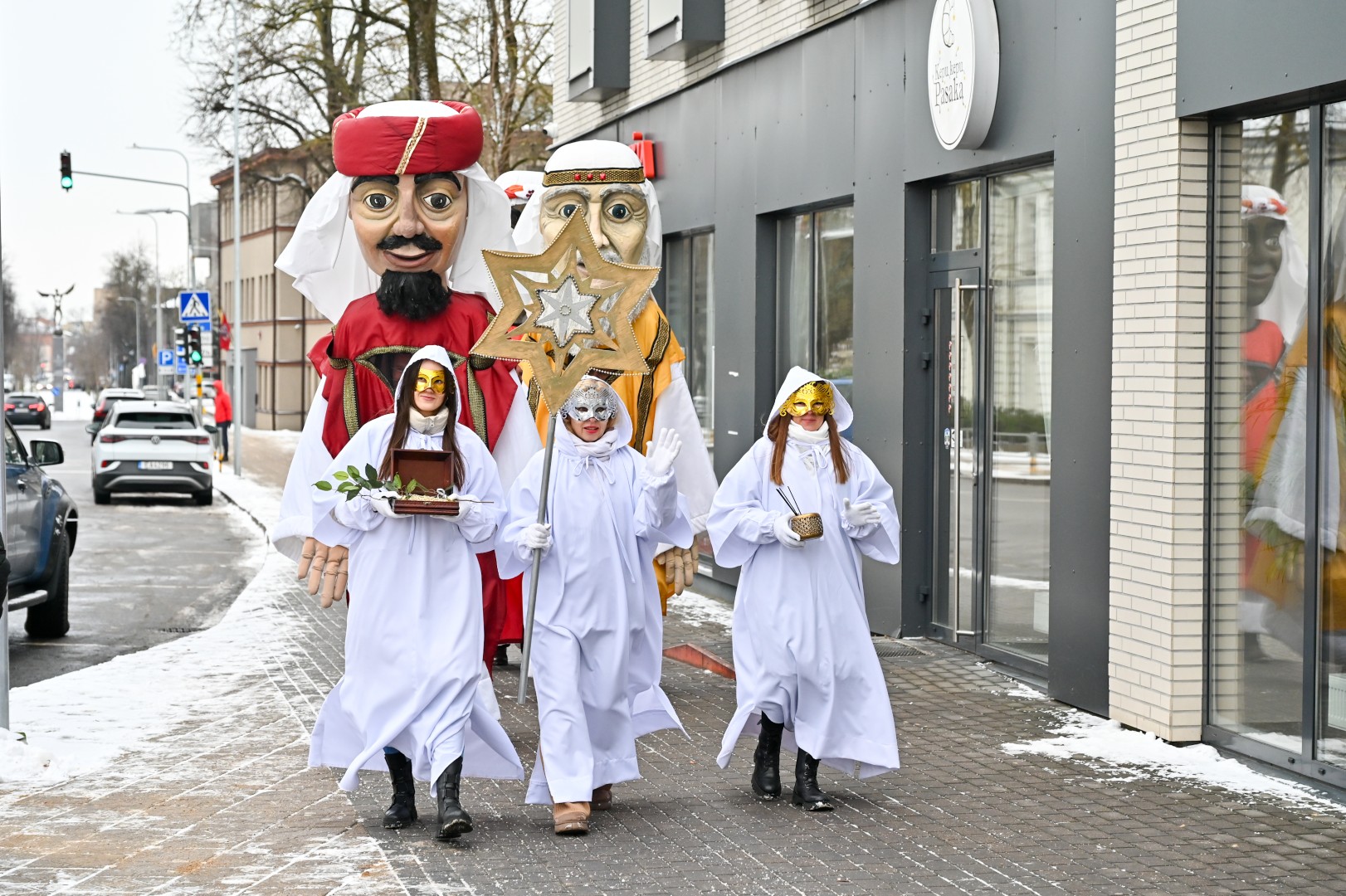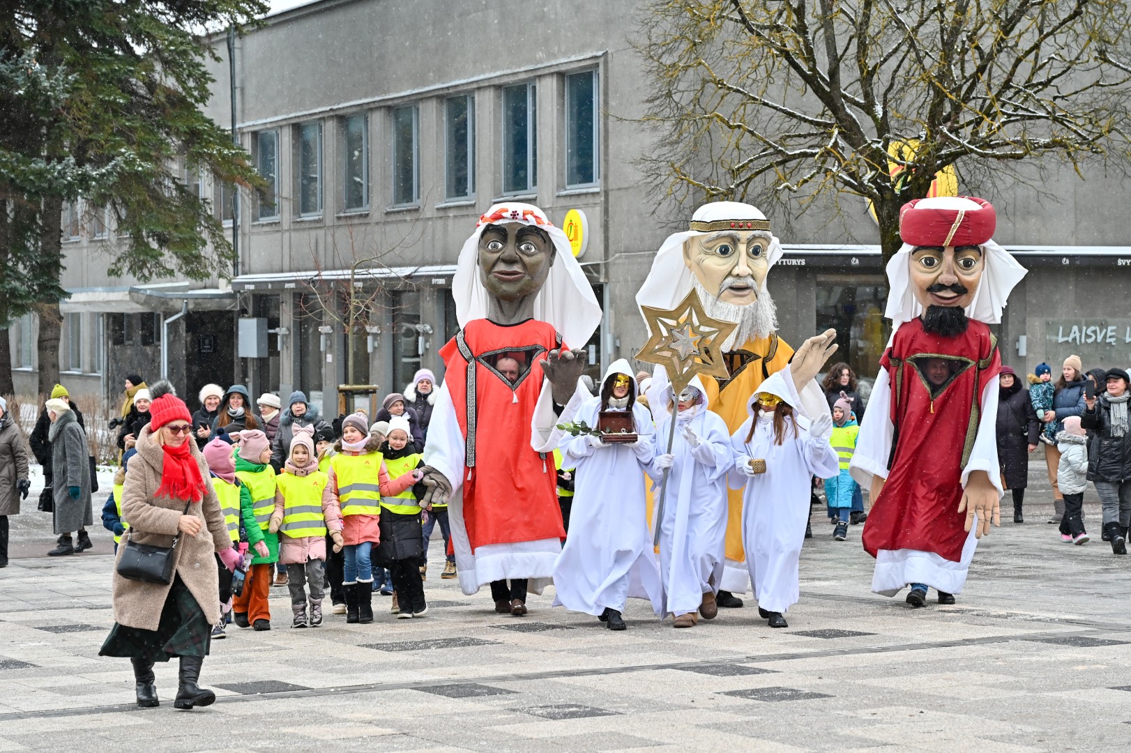 Puspenkto metro ūgio Trys Karaliai – Kasparas, Merkelis (Melchioras) ir Baltazaras – žingsniavo P. Puzino, Respublikos, Vasario 16-osios, Elektros gatvėmis sveikindami praeivius.