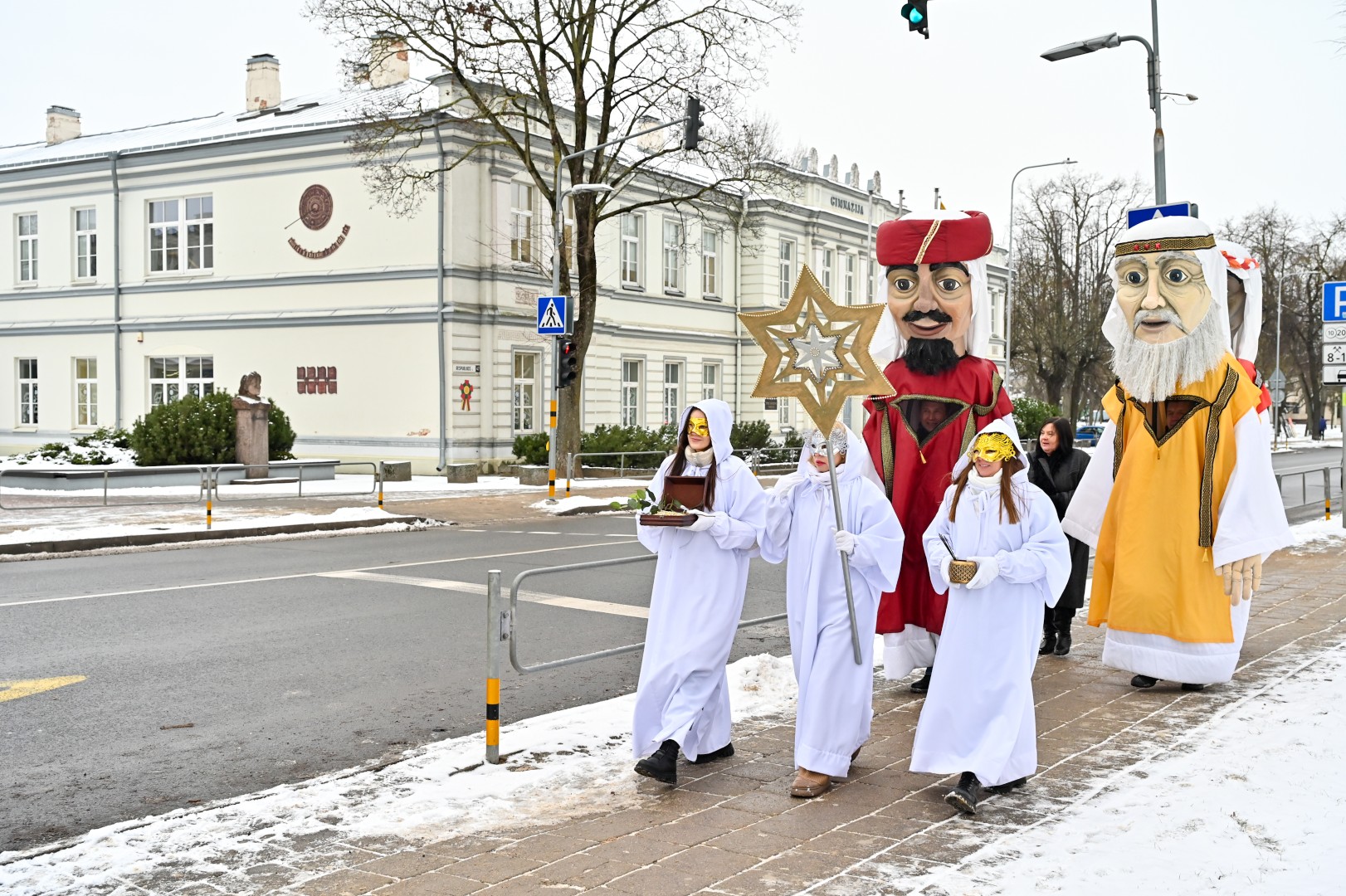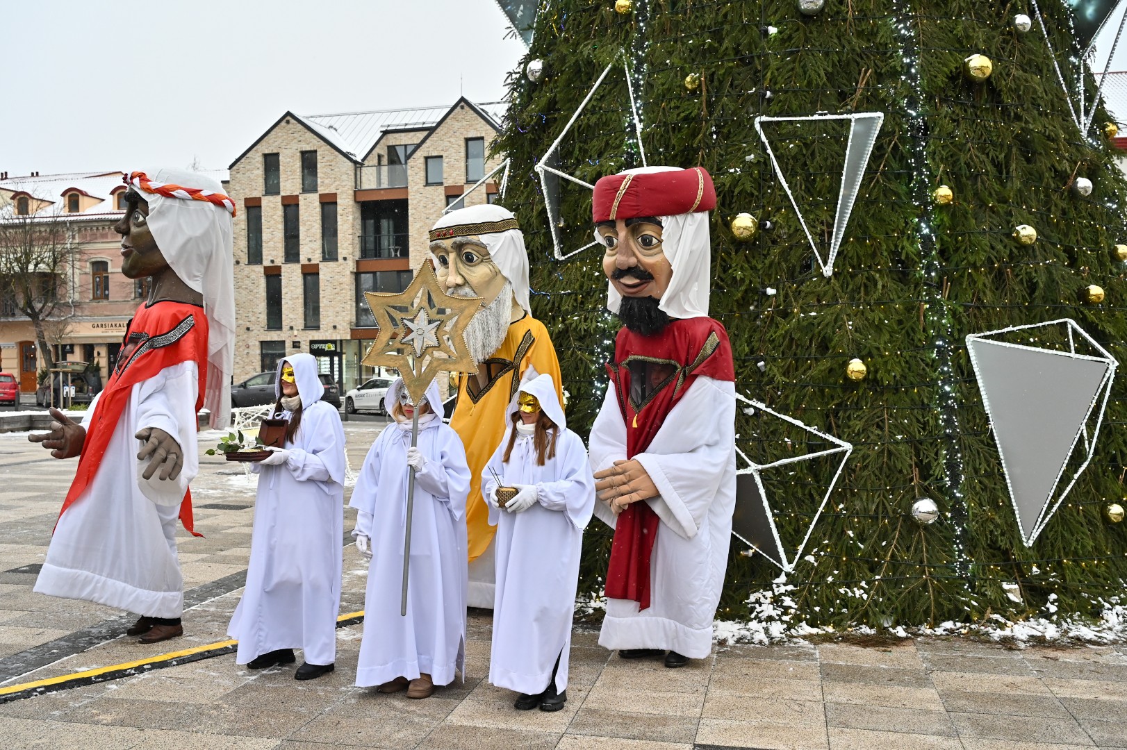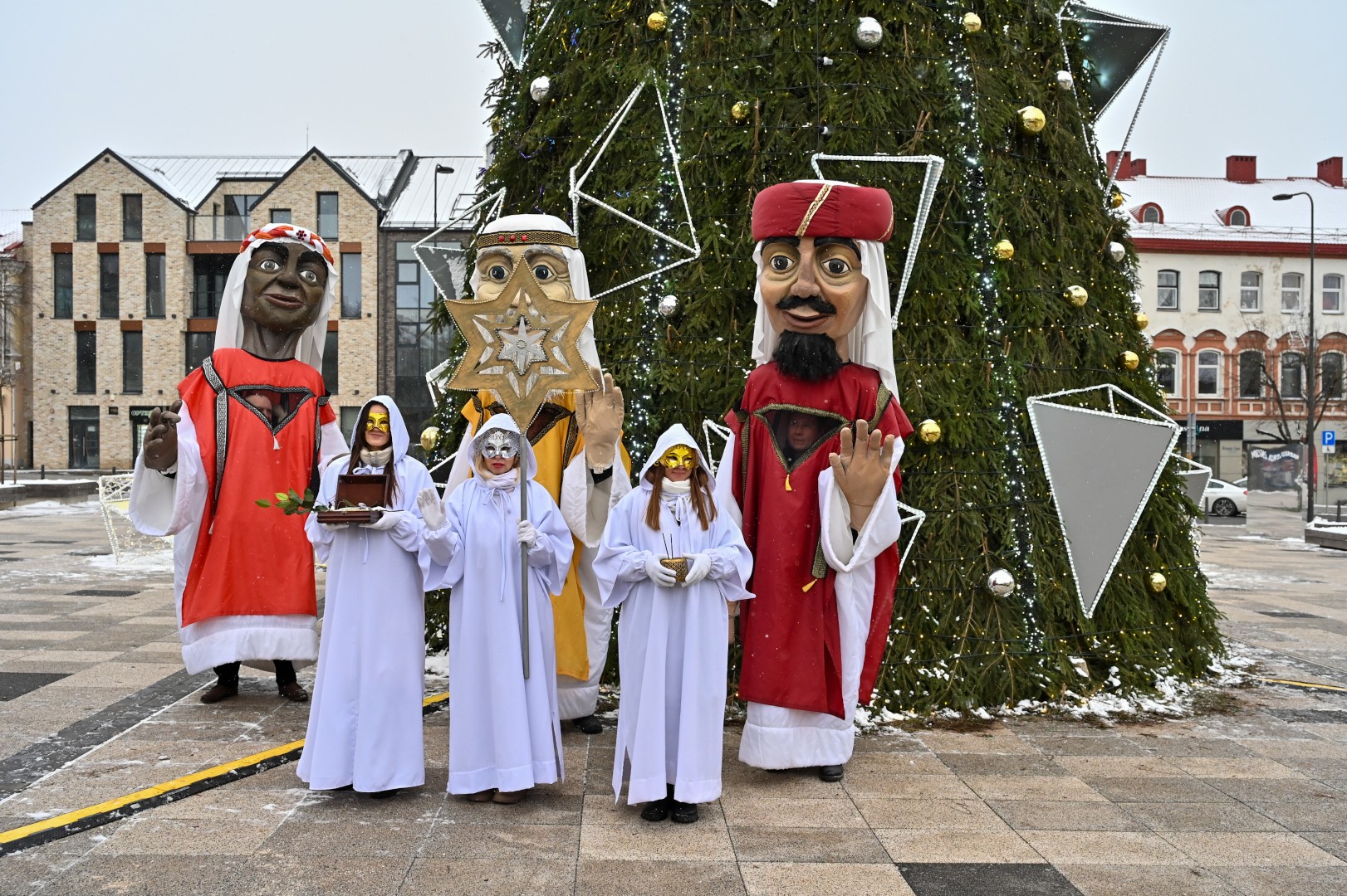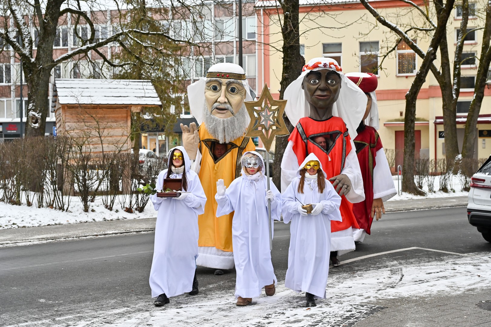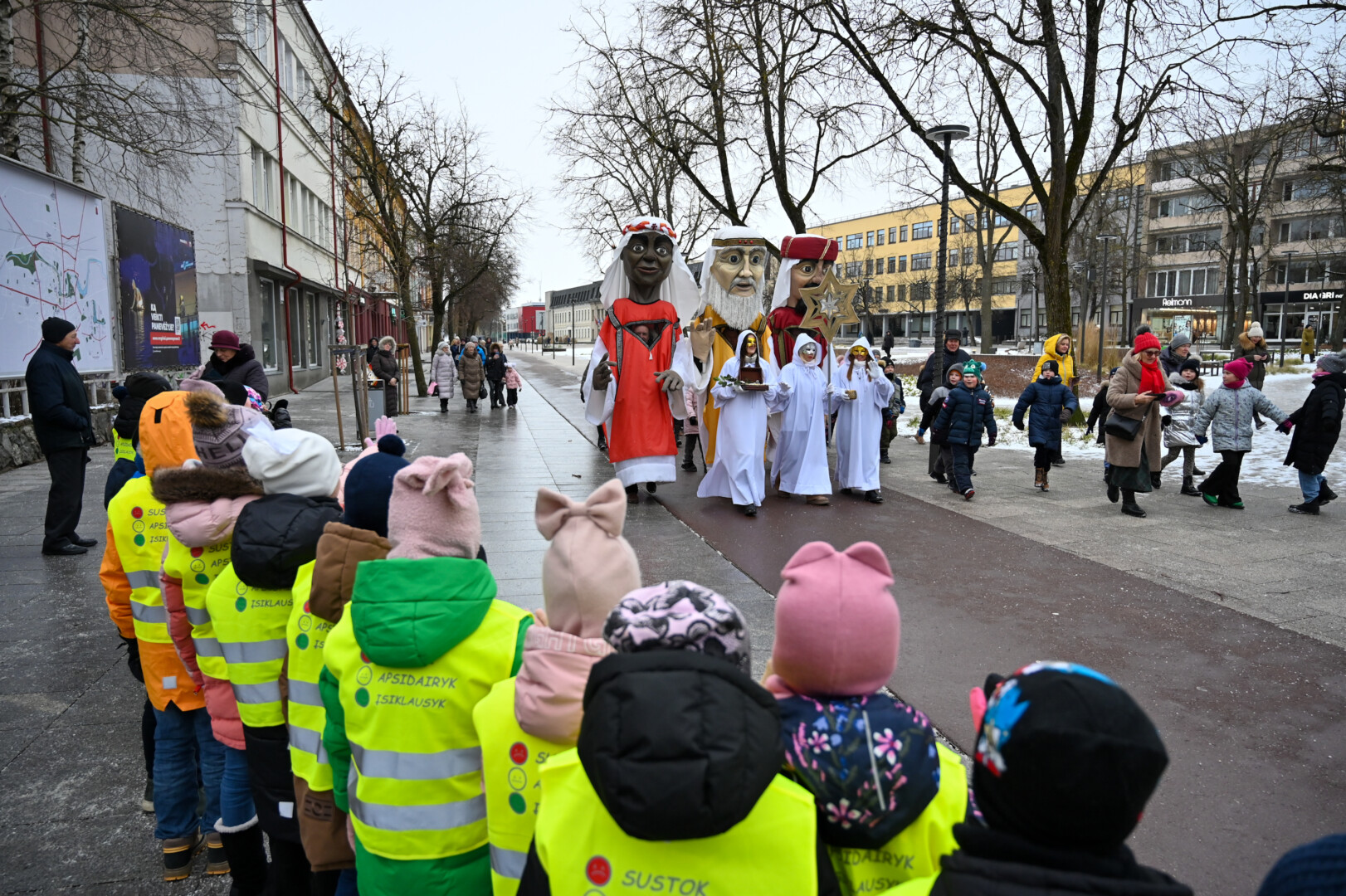 Puspenkto metro ūgio Trys Karaliai – Kasparas, Merkelis (Melchioras) ir Baltazaras – žingsniavo P. Puzino, Respublikos, Vasario 16-osios, Elektros gatvėmis sveikindami praeivius.