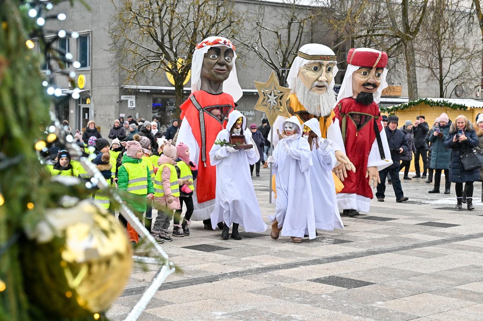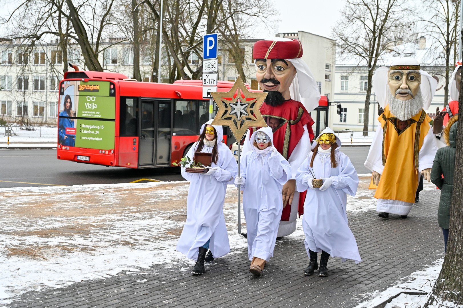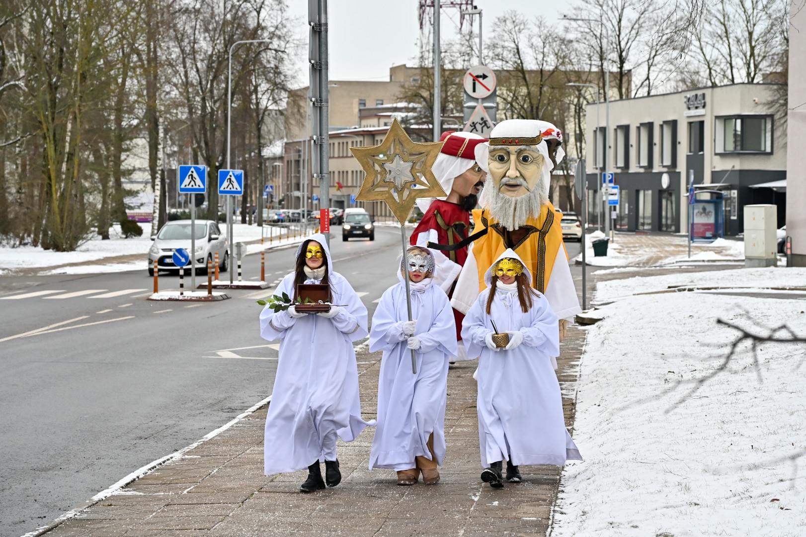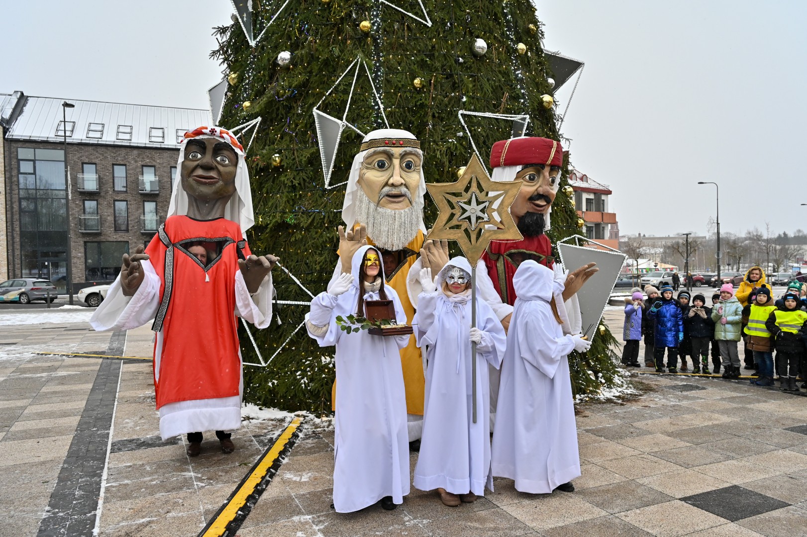 Puspenkto metro ūgio Trys Karaliai – Kasparas, Merkelis (Melchioras) ir Baltazaras – žingsniavo P. Puzino, Respublikos, Vasario 16-osios, Elektros gatvėmis sveikindami praeivius.