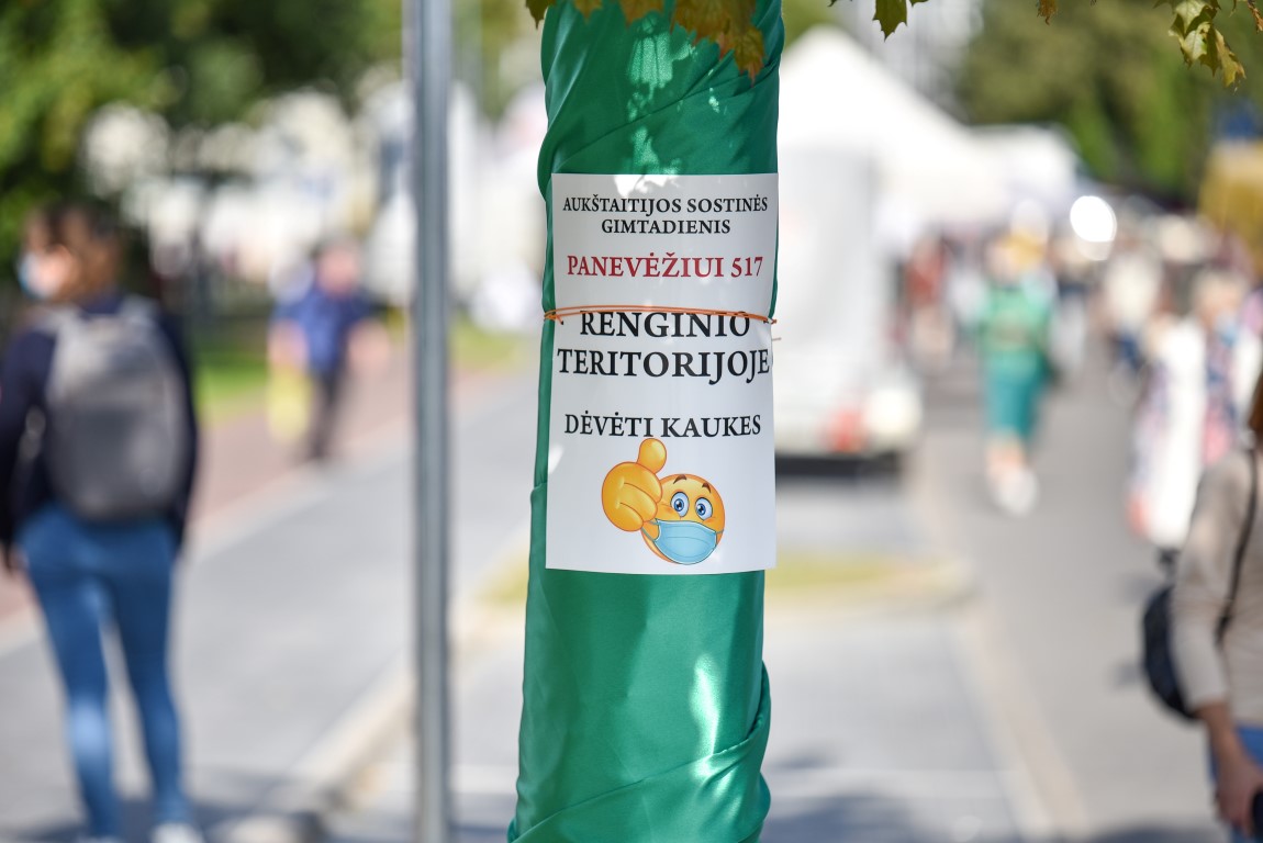 Šių metų Panevėžio gimtadienio „aprangos kodas“ – apsaugos kaukė. Organizatoriai nuolat primins ir reikalavimą laikytis atstumo. Vietas, kur būtina dėvėti kaukes, žymi tam tikri ženklai – šventės spalvomis žalia ir mėlyna padabintos instaliacijos.