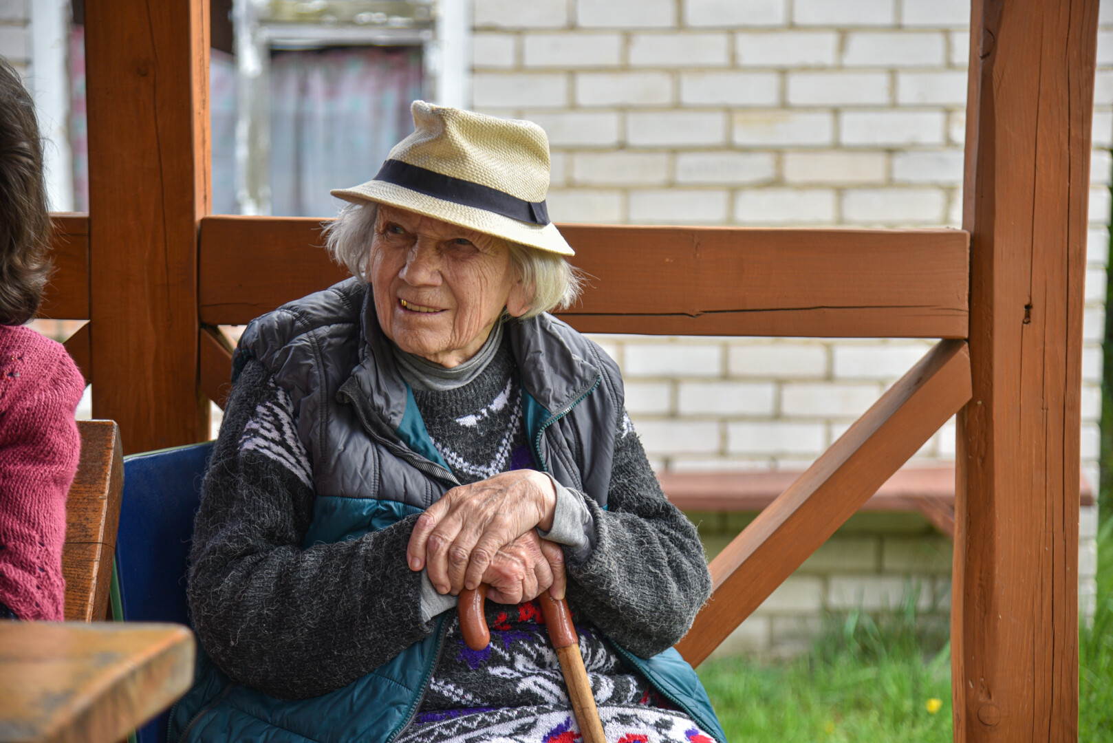 Žvitri moteris juokauja lazdelę tik šiaip besinešiojanti.