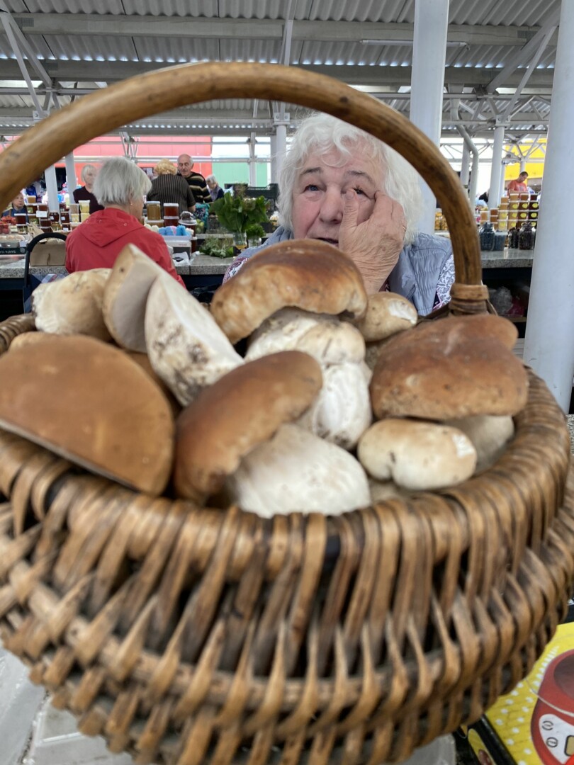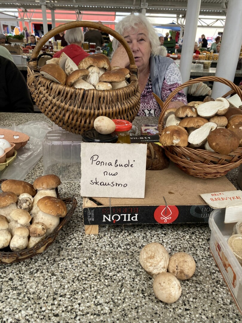 Dabar, anot jos, ant prekystalių jau išrikiuoti grybai, surinkti Šimonių girioje ar Žaliojoje, ar miškuose prie Krekenavos.