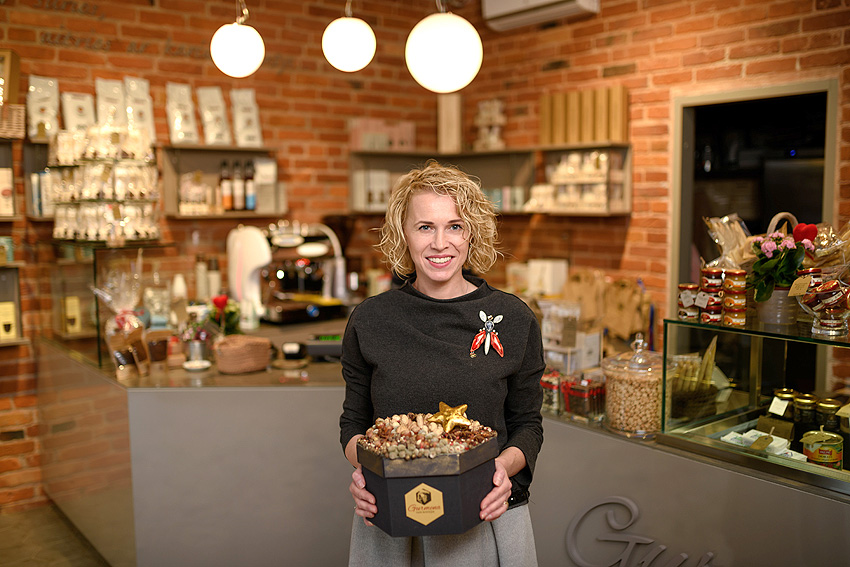 Dovanoms butikėlio savininkė pasirinko šešiakampes dėžutes, priderintas prie bendrovės logotipo ir krautuvėlės interjero, tiksliau – prie šešiakampių grindų plytelių. „Ir į dėžutes aš negaliu prikrauti vien stiklainiukų, dovanojami daiktai turi derėti tarpusavyje, – Lina nė nebandė slėpti esanti perfekcionistė. – Prieššventiniu laikotarpiu juokavome, kad mums viso labo užtektų… 3 produktų, o visi kiti tik papildo asortimentą.“