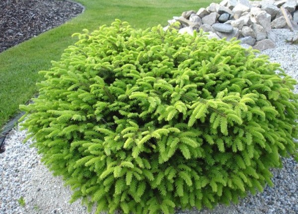 Sode šis nykštukinis krūmelis su minkštą pagalvę primenančia laja teužauga iki 0,5 m aukščio ir 1 m pločio. Spygliai – sodrios žalios spalvos ir labai tankūs.