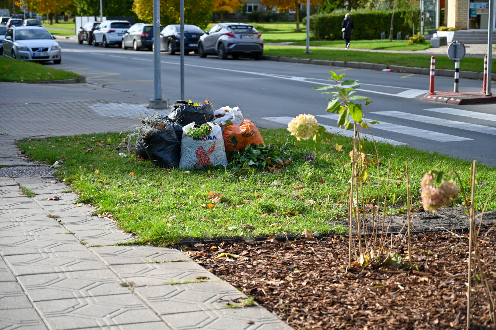 Iškuopusi teritorijas, už kurių sutvarkymą jai neabejotinai mokami pinigai, į maišus surinktas atliekas moteriškė iškrauna šalia hortenzijų gėlynų, kuriais prieš dvi savaites apsodinti konteineriai šalia Kniaudiškių gatvės.