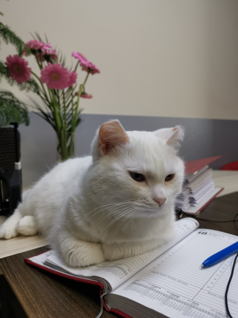 Deja, kitų katinų draugija ją labai erzino, baltapūkė vis nerado sau vietos ir kentėjo. Tad prieglaudos buhalteriją tvarkančios įmonės vadovė nutarė šiai laukinukei suteikti galimybę augti jų biure.