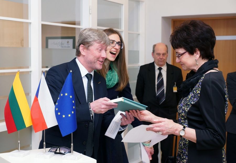 Čekijos Respublikos ambasadorius Lietuvoje Bohumilas Mazanekas džiaugėsi bibliotekos leidiniais, kuriuos įteikė bibliotekos direktorė Rima Maselytė. V. Benašo nuotr.