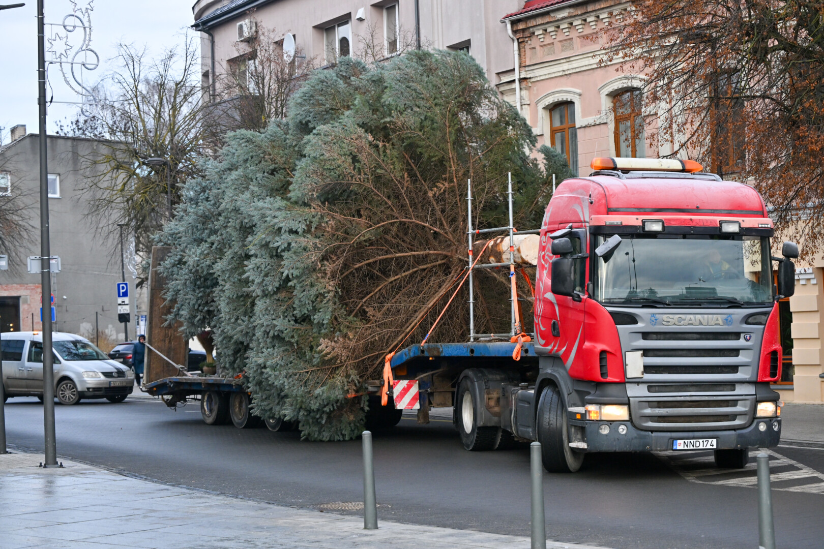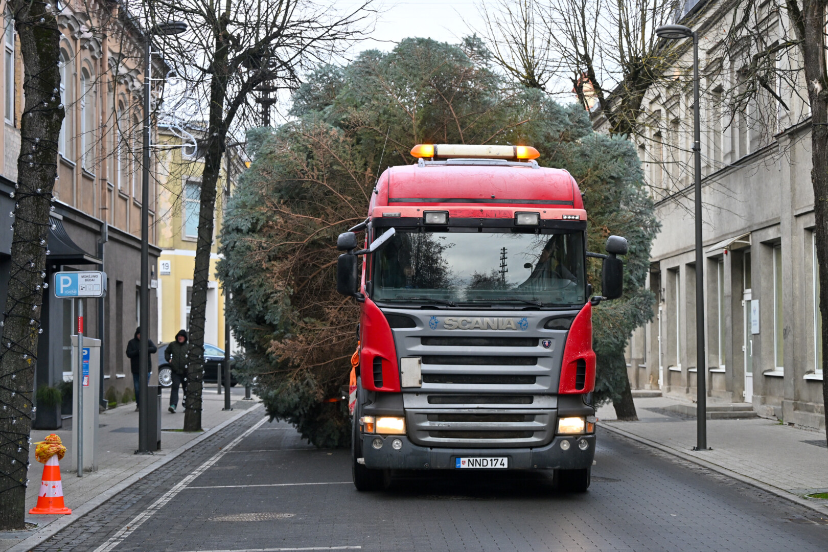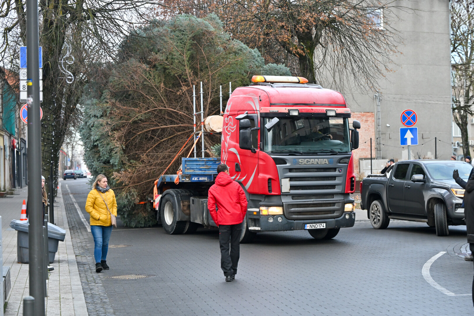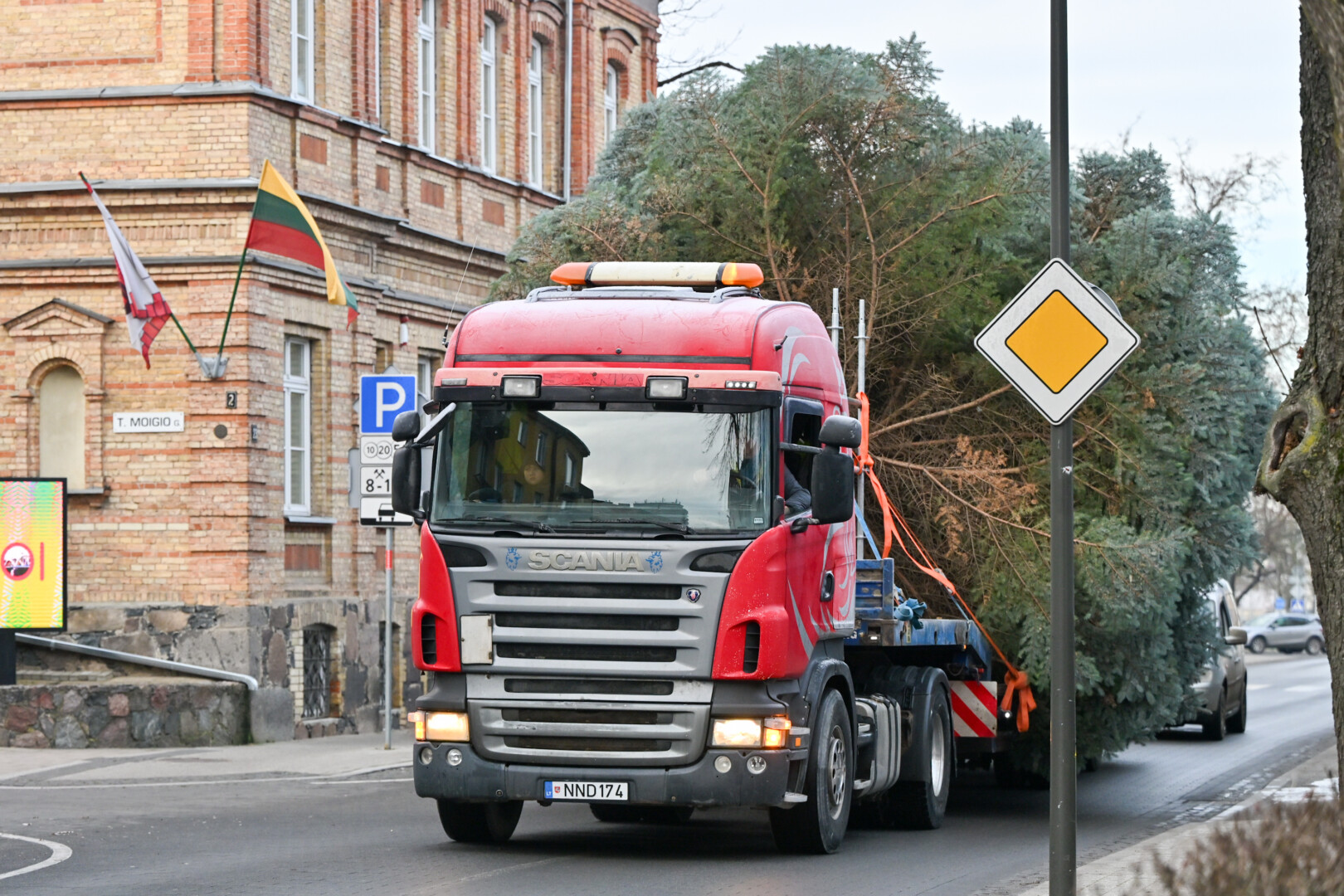 Pasak „GES projektai“ direktorės Erinijos Svarinskienės, nupjauti ne vieną toną sveriantį maždaug 15 metrų aukščio medį ir atgabenti į miesto centrą – sudėtinga užduotis.