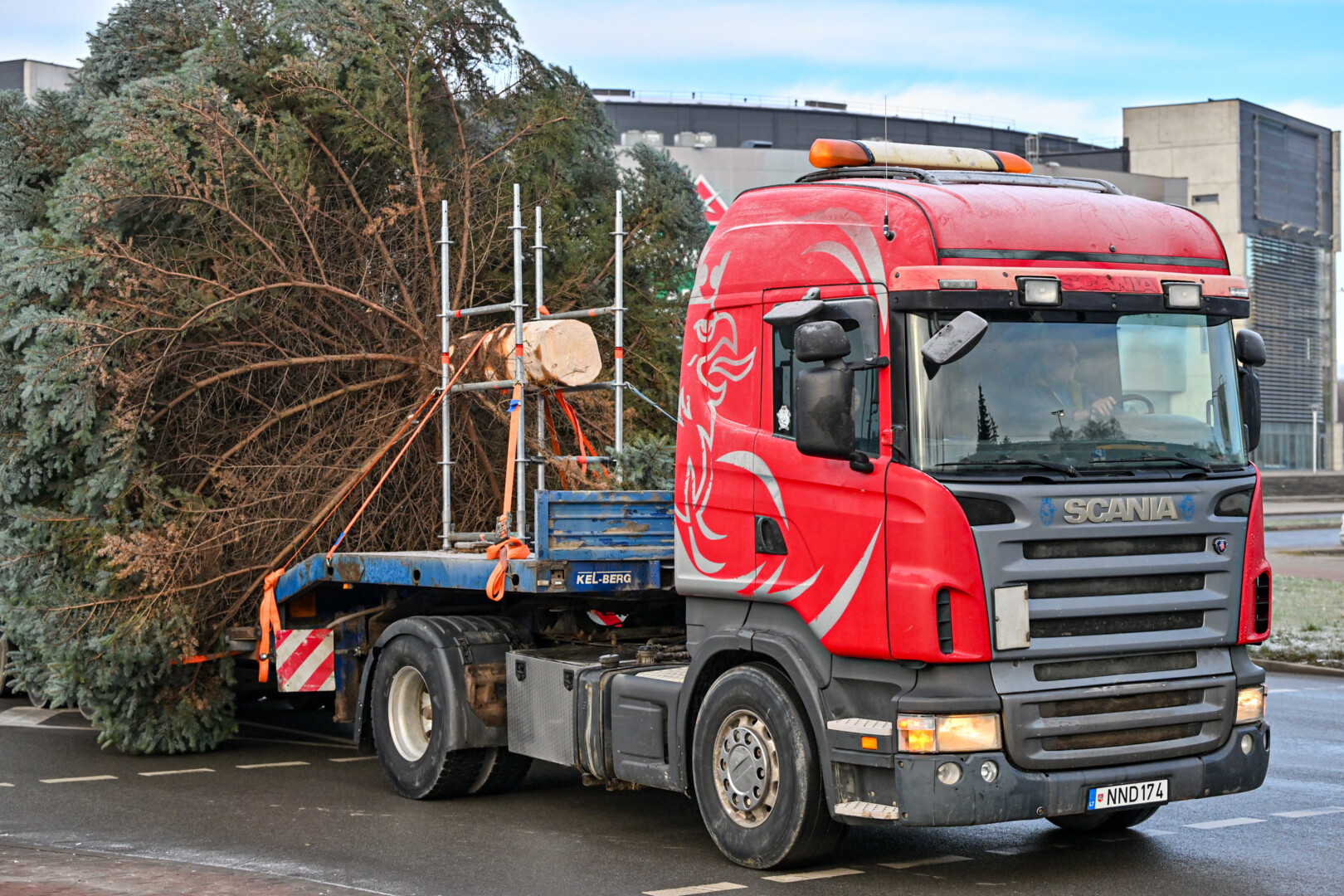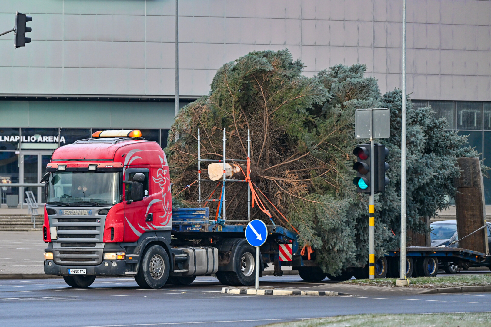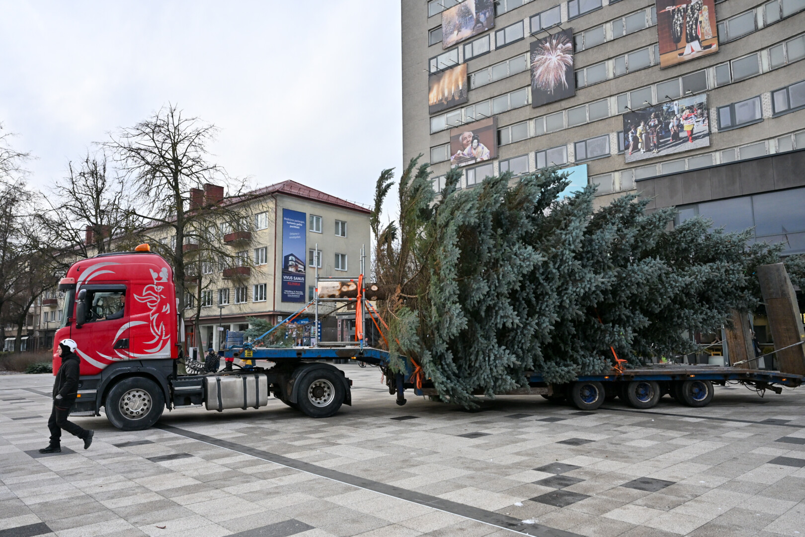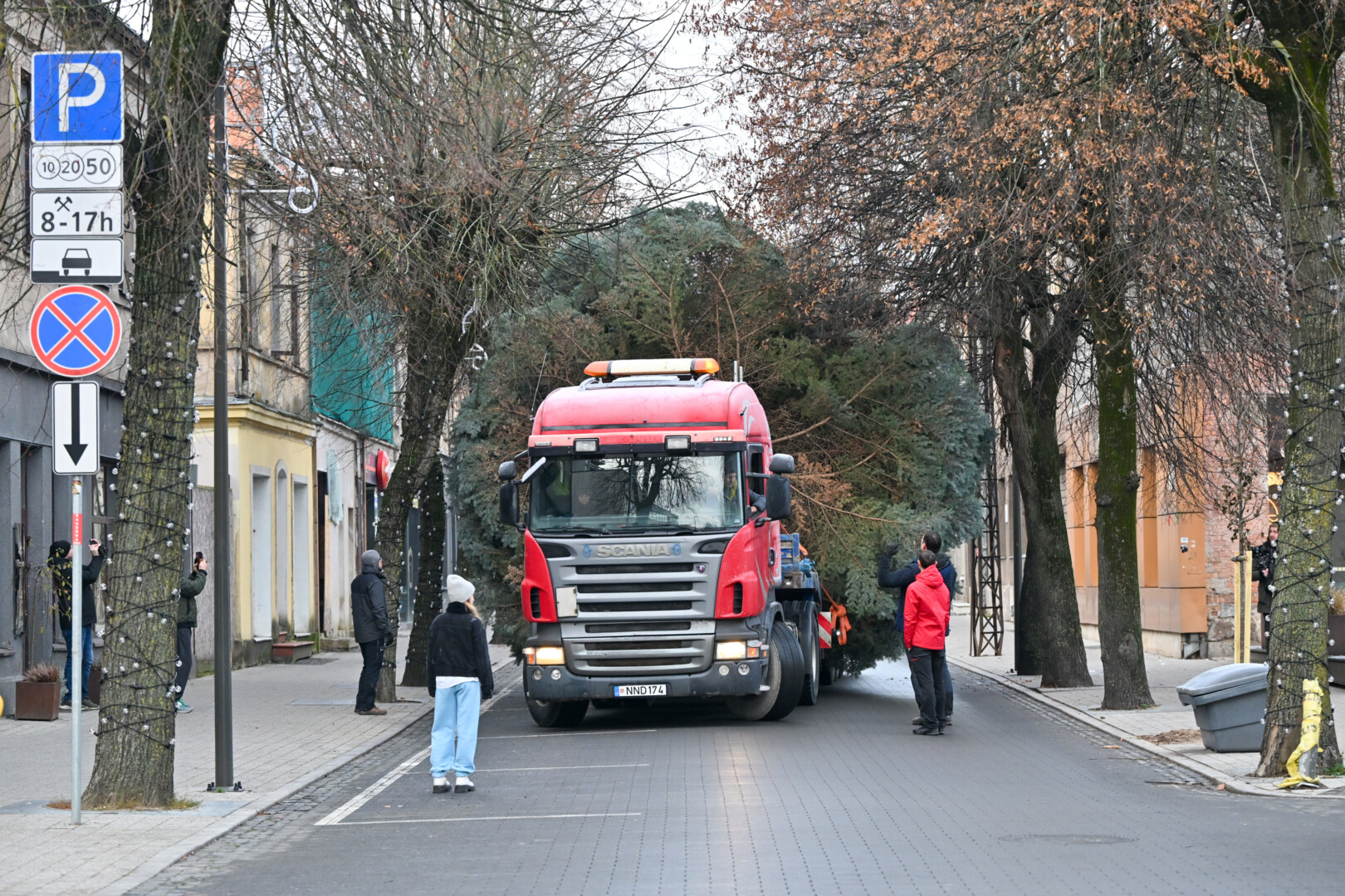 Panevėžyje jau kvepia Kalėdomis. Į Laisvės aikštę sekmadienį išgabenta panevėžiečių šeimos dovanota eglė.