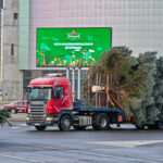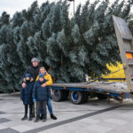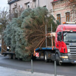 Visgi gražuolė eglė saugiai nupjauta, supakuota ir išvežta į miesto centrą.