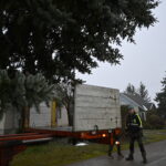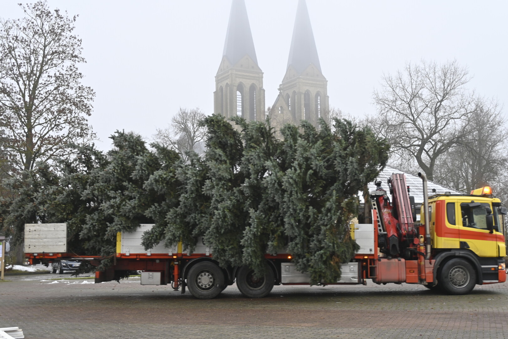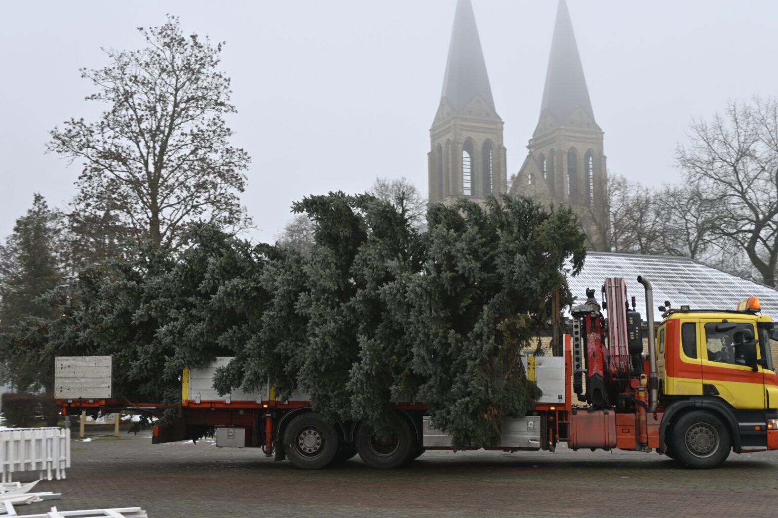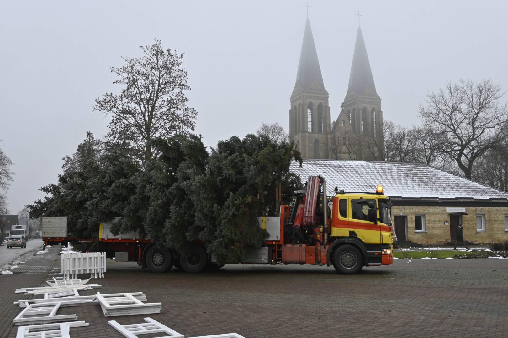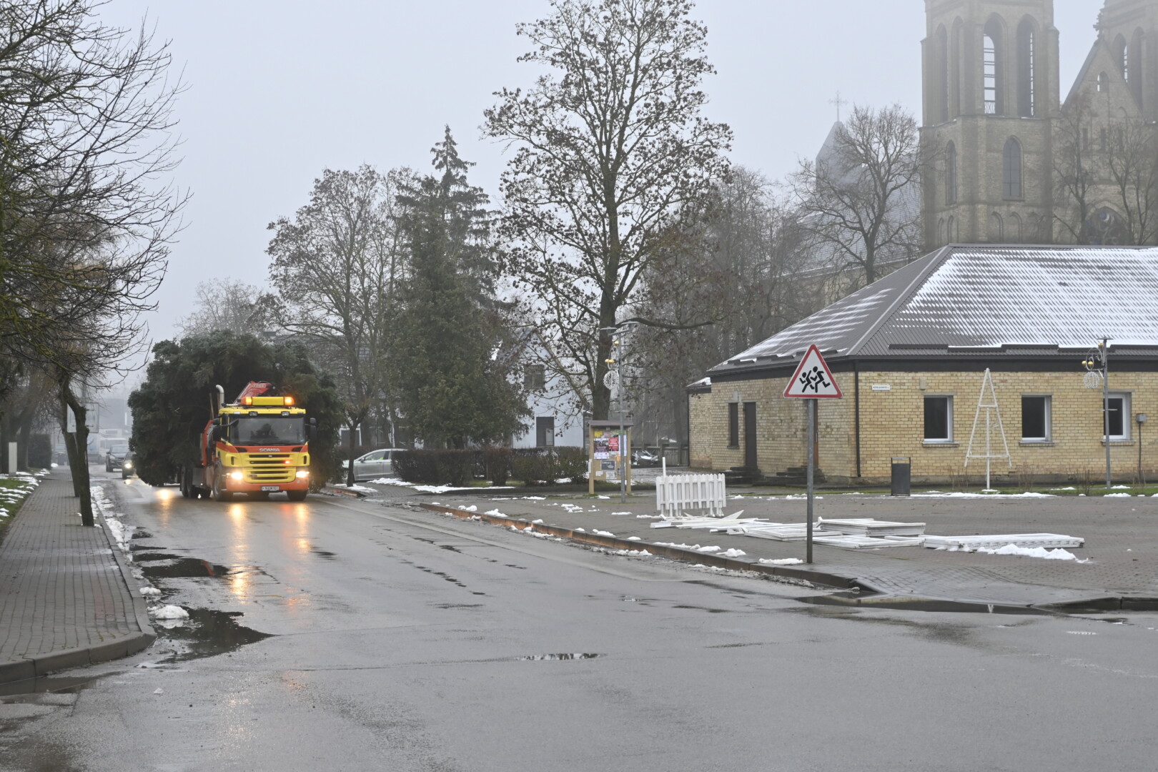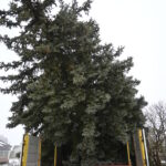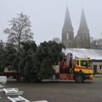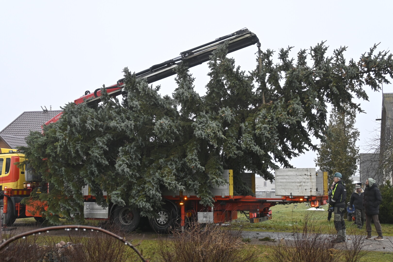 Pagrindinė Panevėžio rajono kalėdinė eglė šįmet nušvis Naujamiestyje. Nors iki jos įžiebimo šventės likę apie porą savaičių, žaliaskarė jau pirmadienį sunkiosios technikos atgabenta į miestelio aikštę.