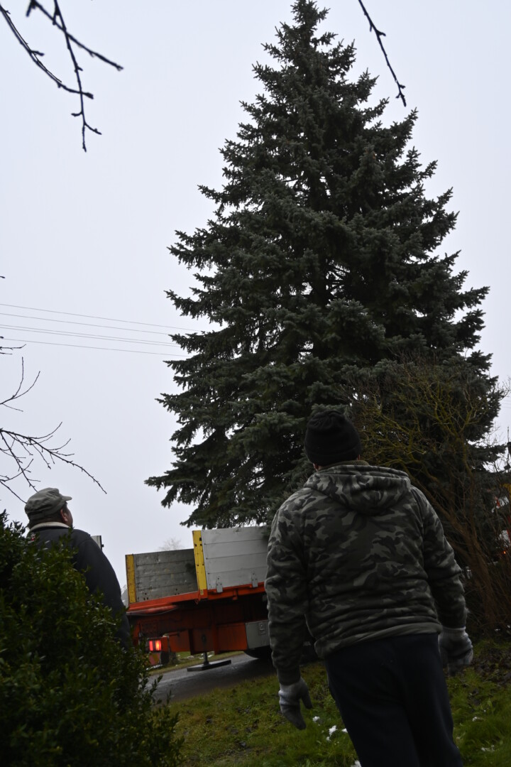 Maždaug 12 metrų aukščio žaliaskarės šeimininkai už simbolinę kainą sutiko, kad jų gražuolė taptų viso rajono šventiniu akcentu.