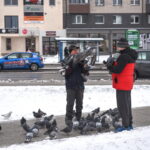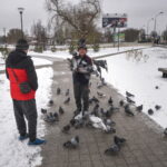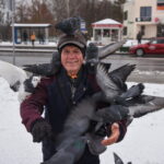 Kartu su žiema į Panevėžio centrą sugrįžo ir savotišku jo simboliu jau tapęs senjoras su pulku balandžių.