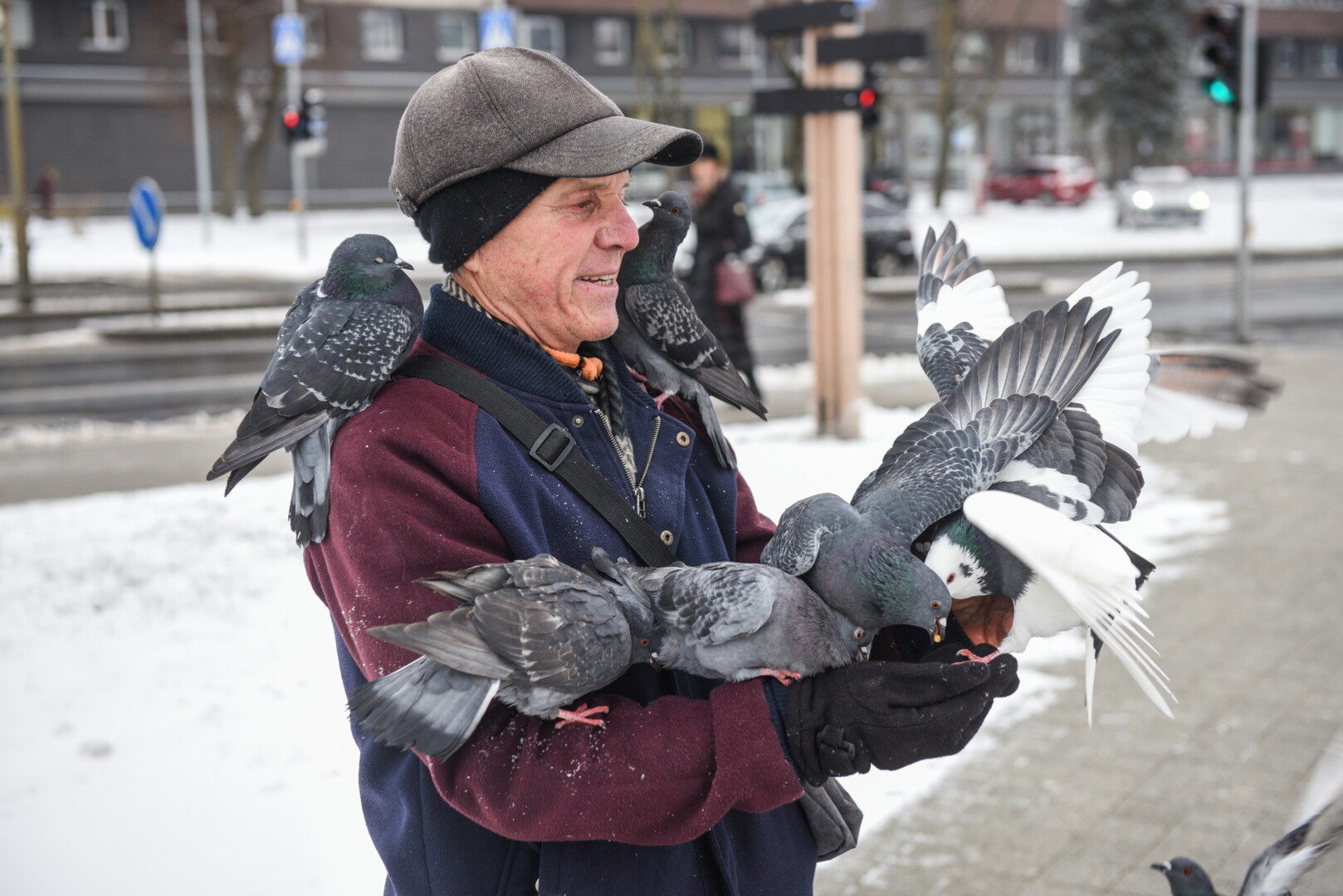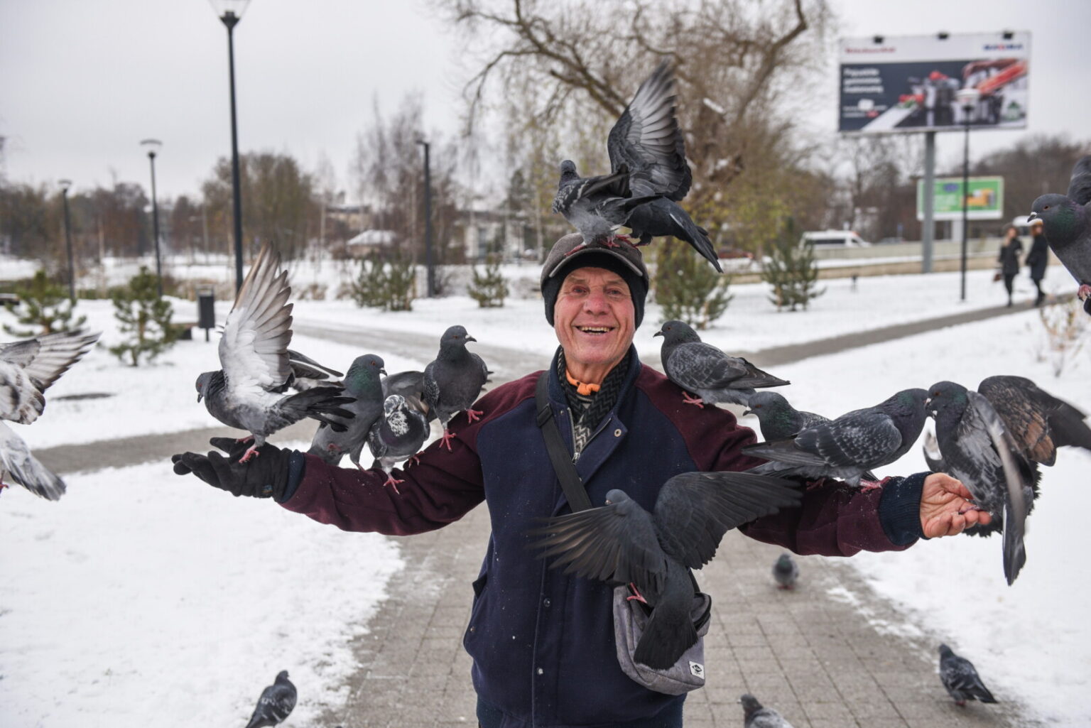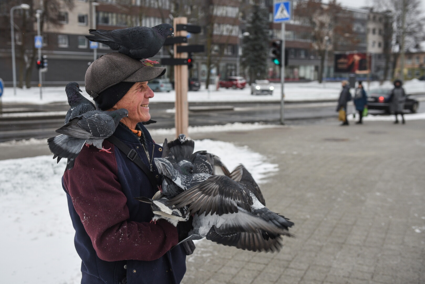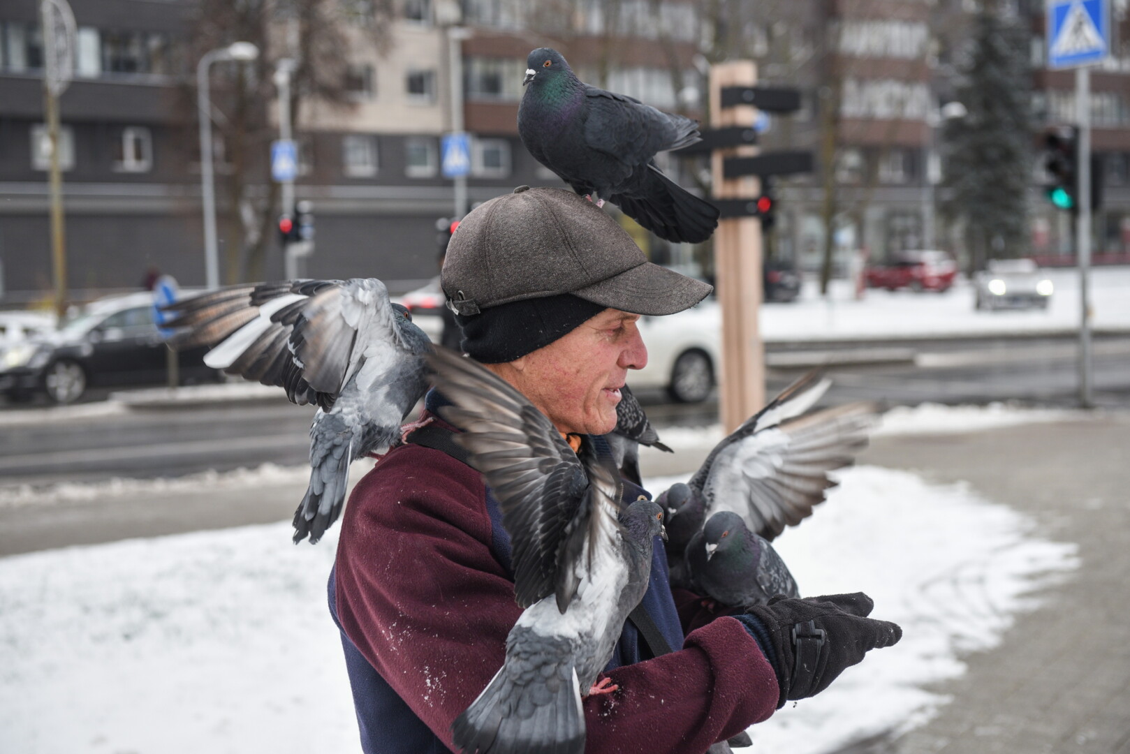 Kaip daugelis kas rytą skuba į darbus, taip panevėžietis Pijus Bajorūnas atšalus orams – lesinti balandžių.
