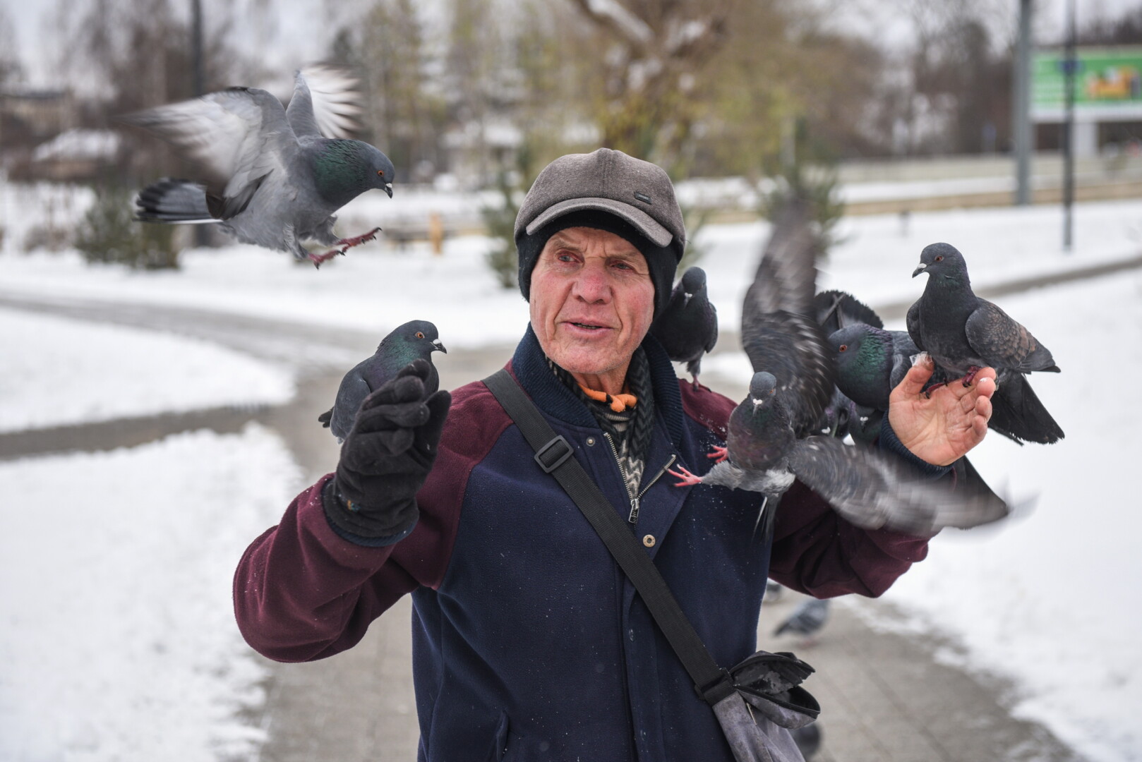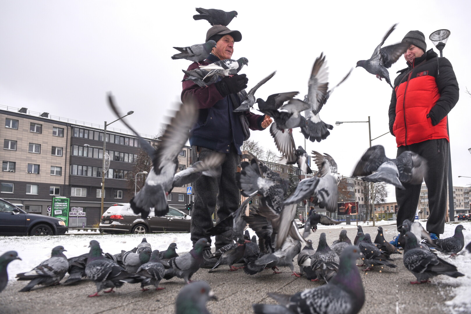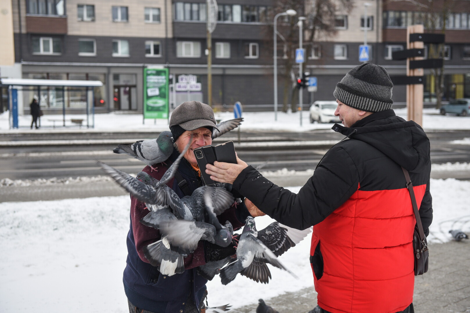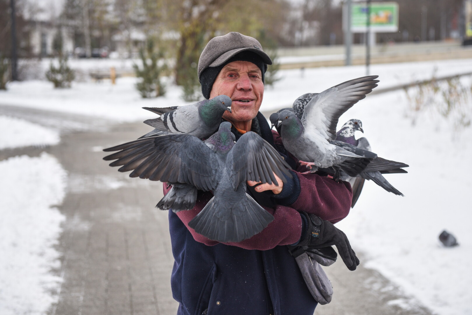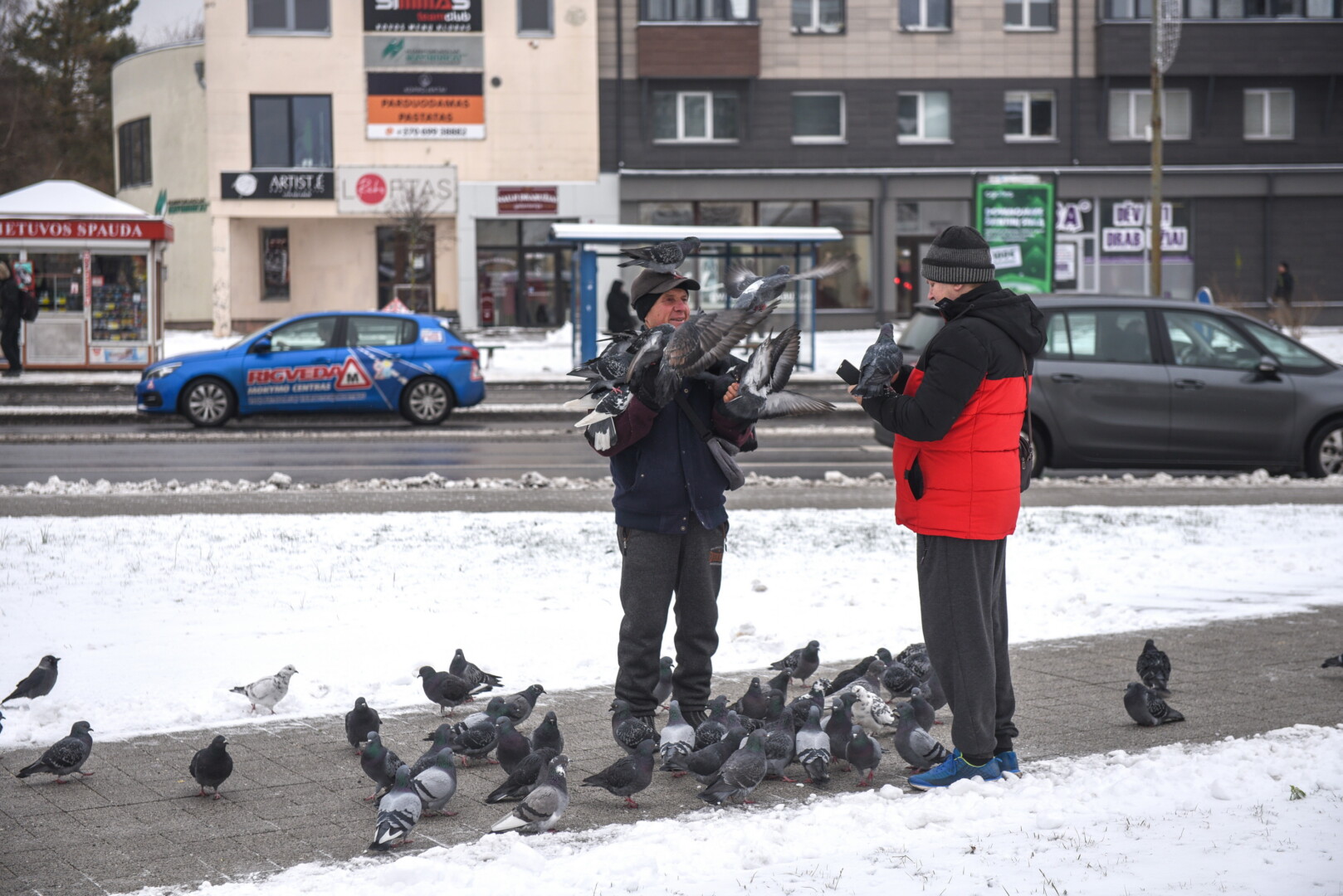Kaip daugelis kas rytą skuba į darbus, taip panevėžietis Pijus Bajorūnas atšalus orams – lesinti balandžių.