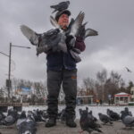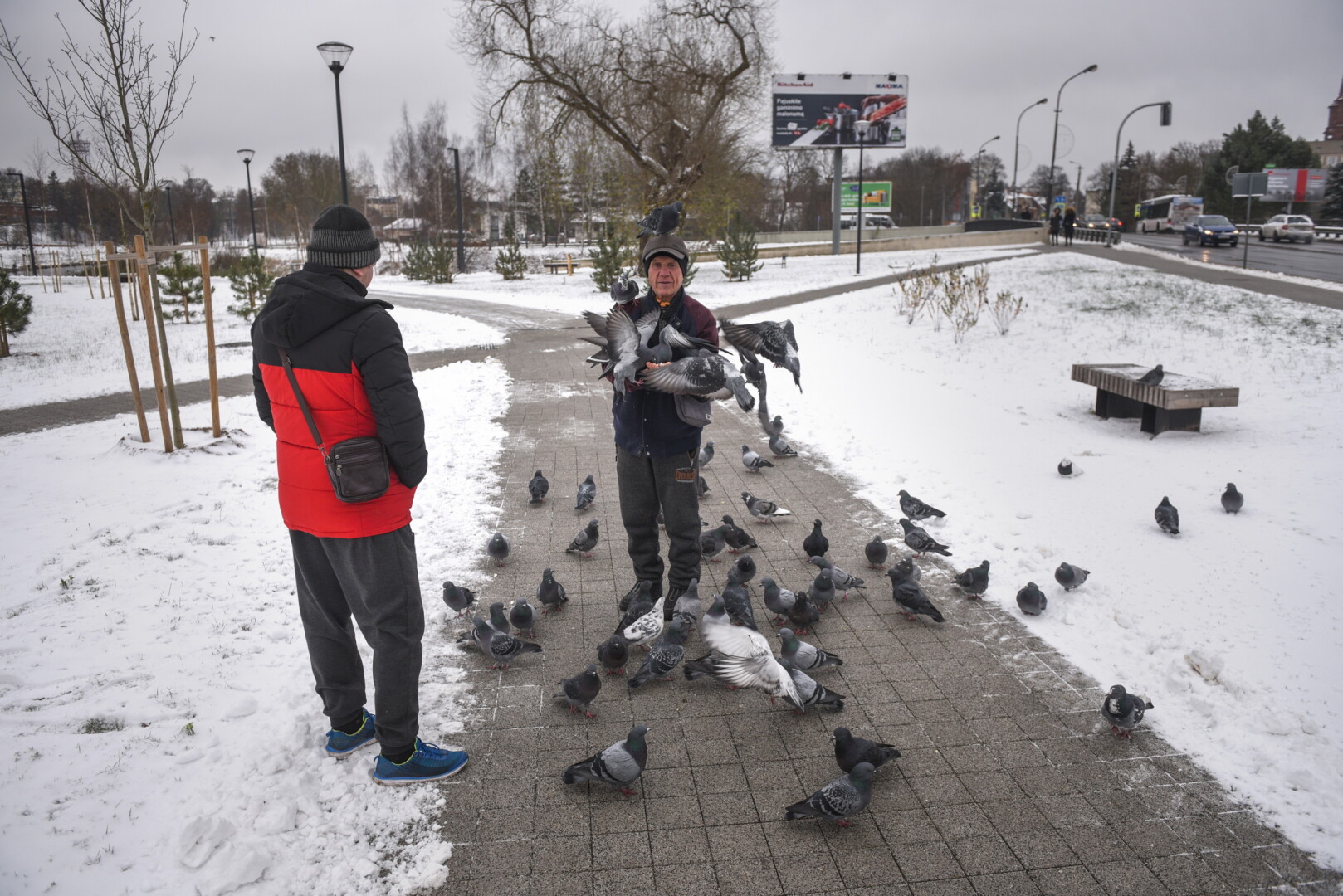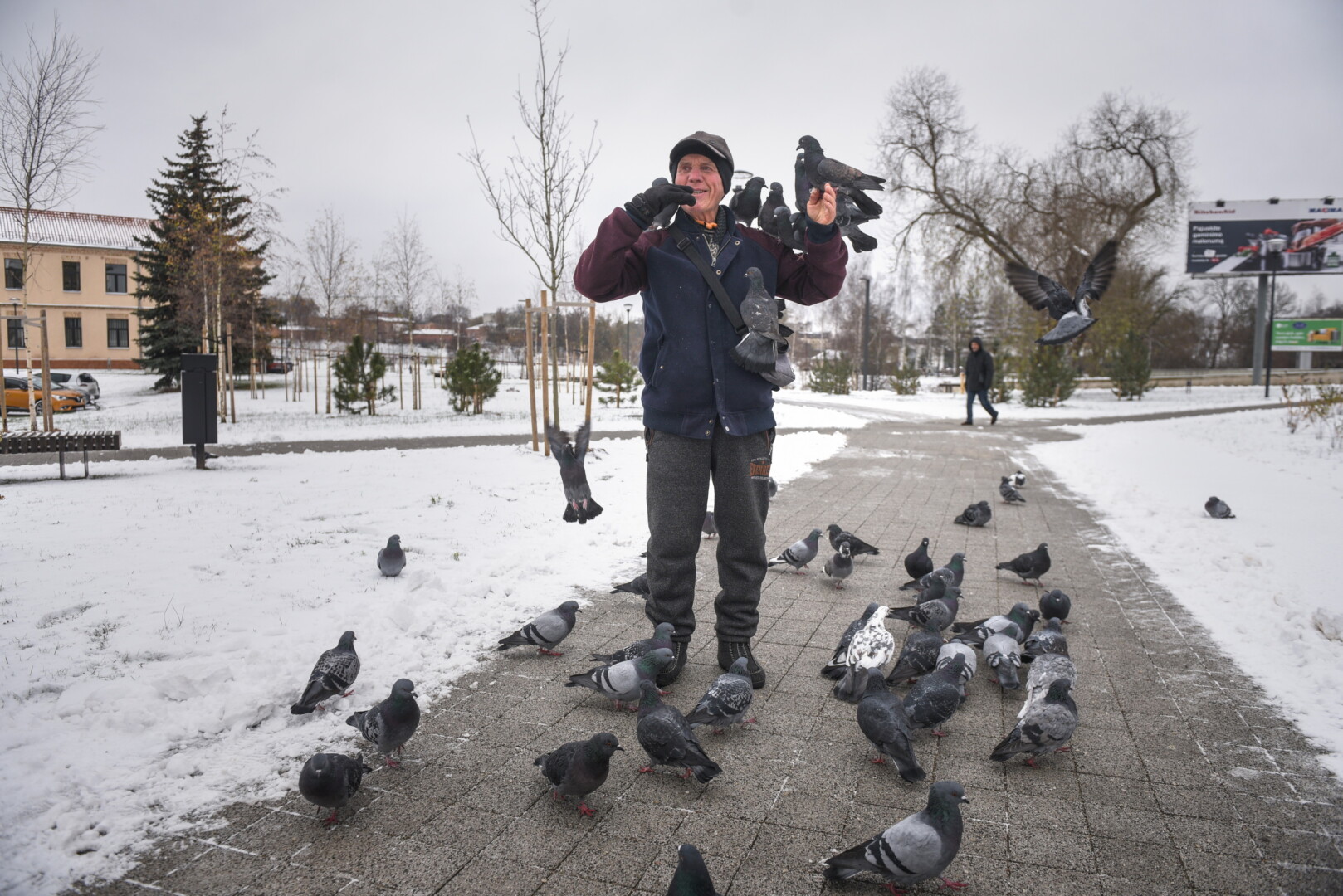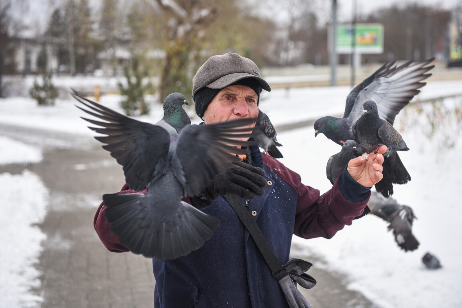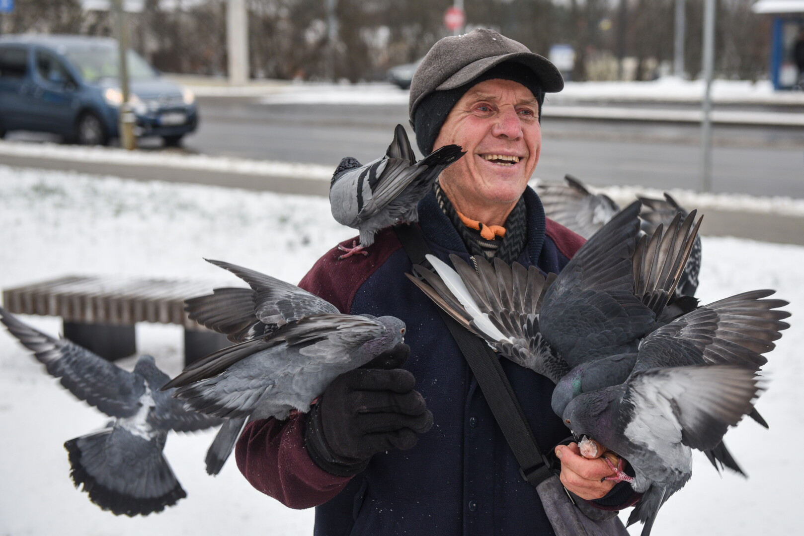 Kaip daugelis kas rytą skuba į darbus, taip panevėžietis Pijus Bajorūnas atšalus orams – lesinti balandžių.